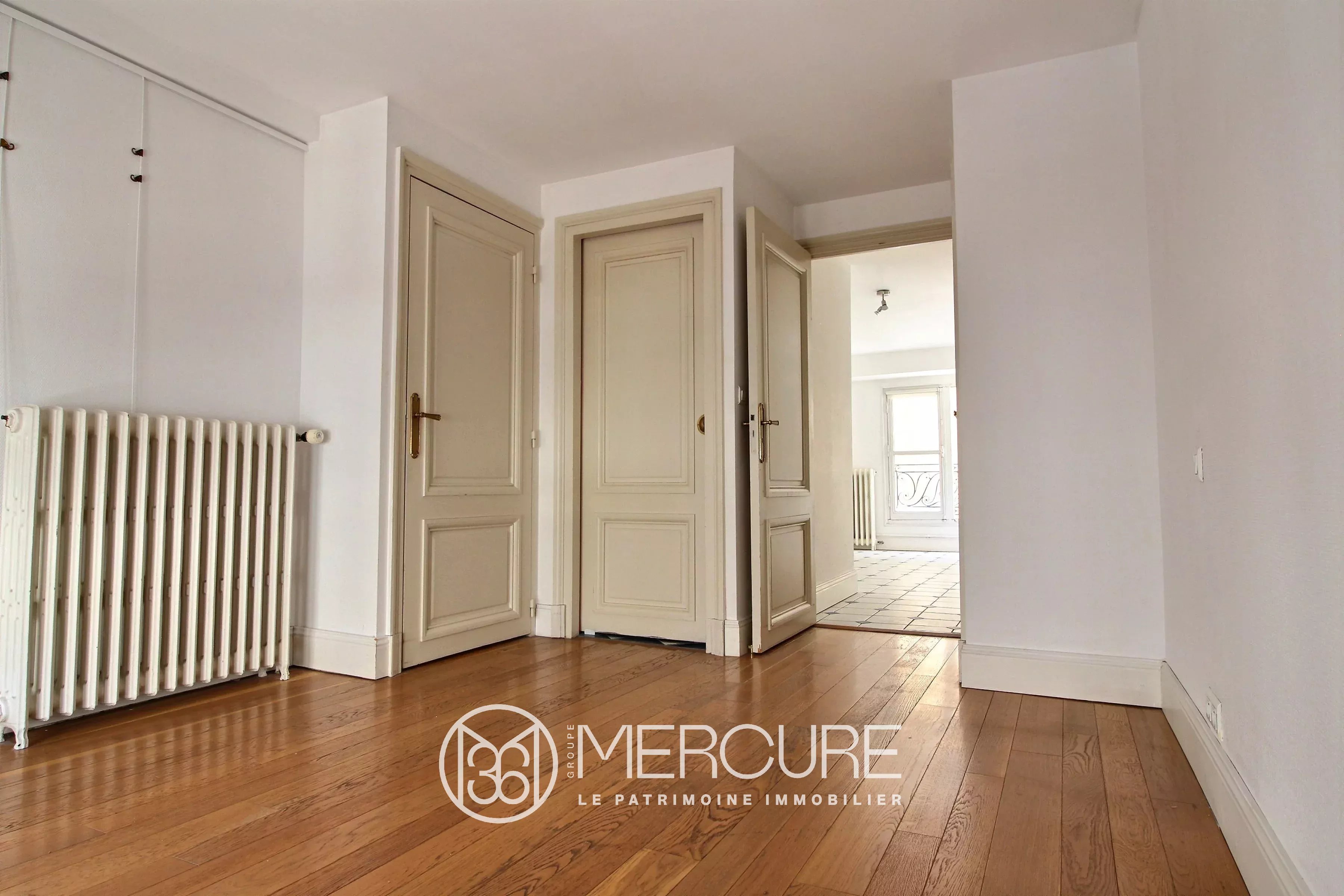 En étage élevé, accessible en ascenseur par le niveau inférieur, l’appartement est particulièrement lumineux. Orienté sud, le séjour bénéficie de deux fenêtres donnant sur une petite cour en pierre. Il n’y a aucun vis-à-vis et l’environnement est extrêmement calme. Il s’agit du seul logement à ce palier.