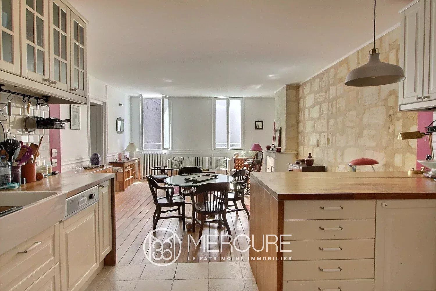 Toujours côté cour, le séjour est prolongé d’une cuisine entièrement équipée avec des matériaux de qualité (plan de travail en chêne massif, placards vitrés et carrelage en travertin au sol) et un cellier éclairé par un puit de jour.