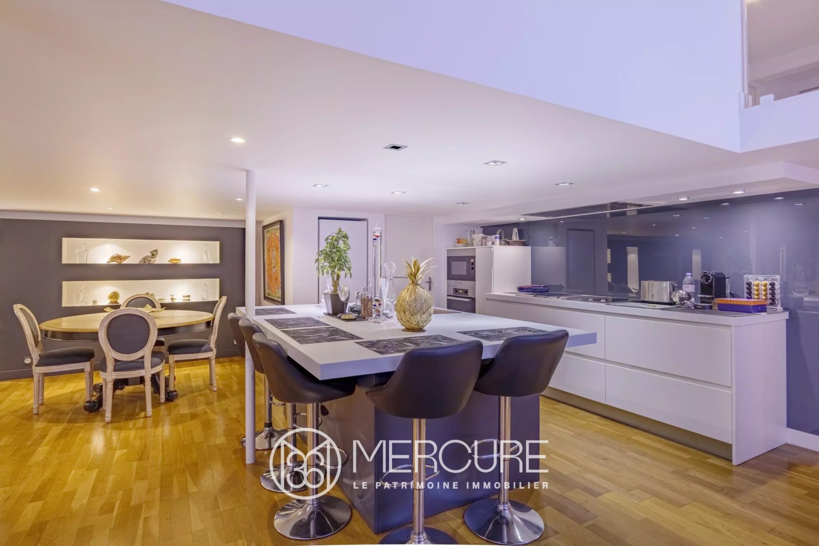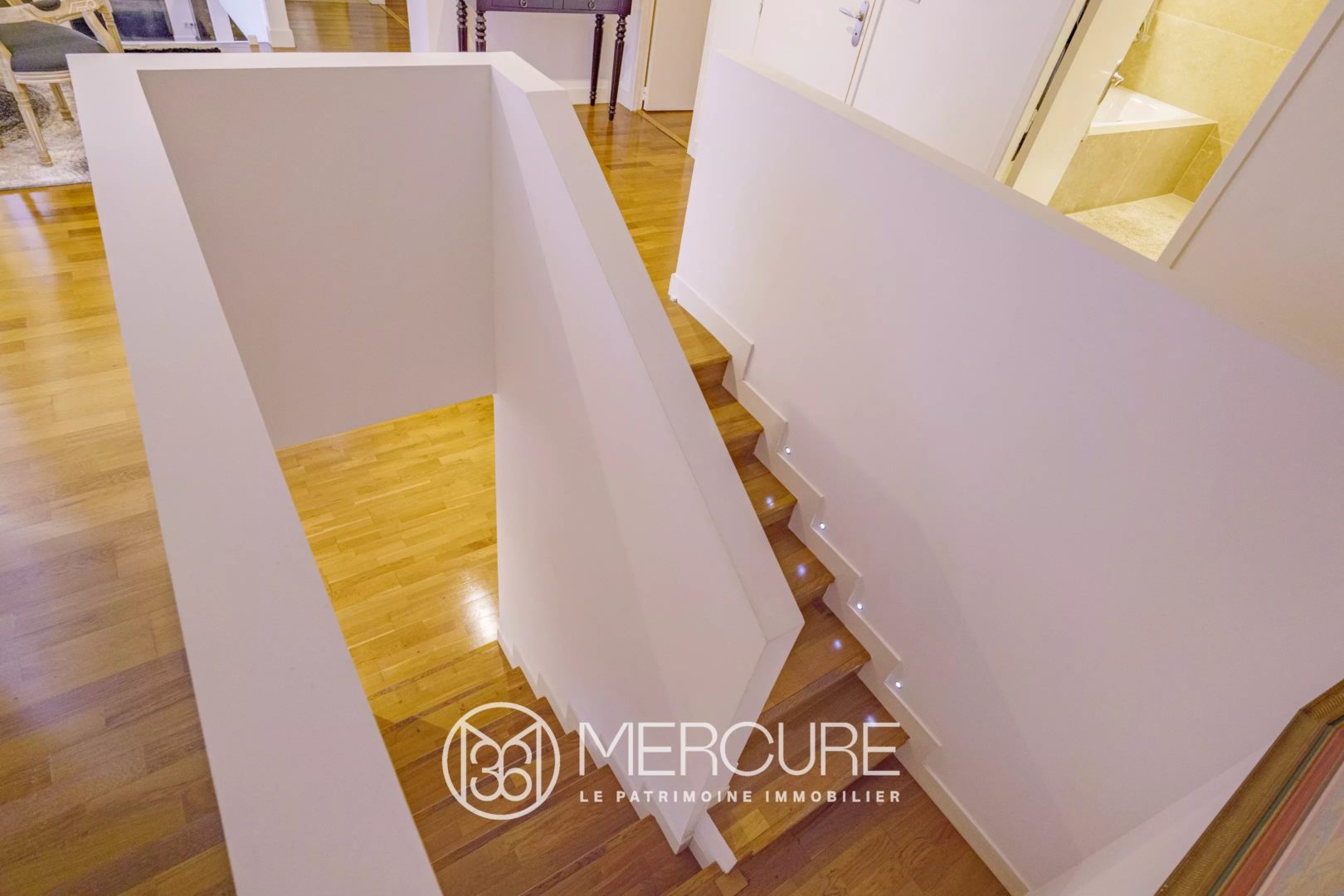 À l’étage, un élégant dégagement dessert une seconde chambre de 23 m², une salle de bain rénovée avec des prestations haut de gamme, un deuxième wc séparé, ainsi qu’un salon/bureau en mezzanine de 23 m², surplombant le séjour et offrant un espace de détente ou de travail inspirant.