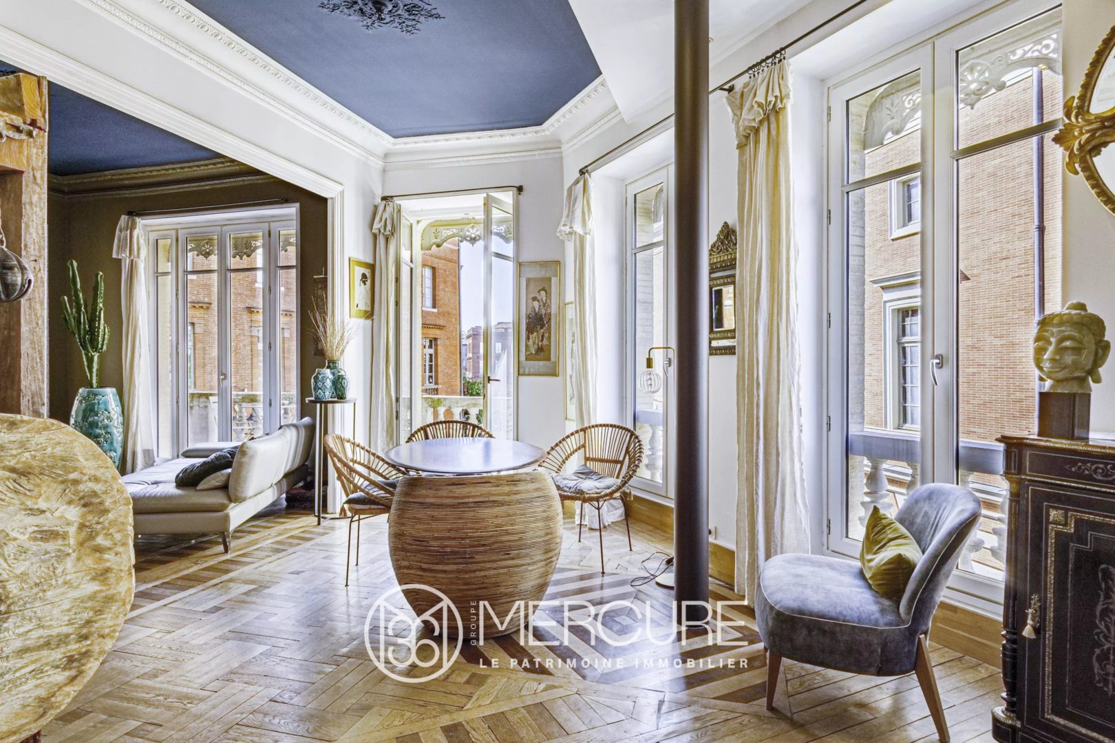 Bénéficiant de trois façades en angle, chacune agrémentée d’un balcon orienté est, sud et ouest, l’appartement offre pas moins de treize baies vitrées à double et triple vitrage. Cette ouverture exceptionnelle sur la ville et ses monuments historiques permet de profiter pleinement de la vie toulousaine, sans aucune nuisance sonore.