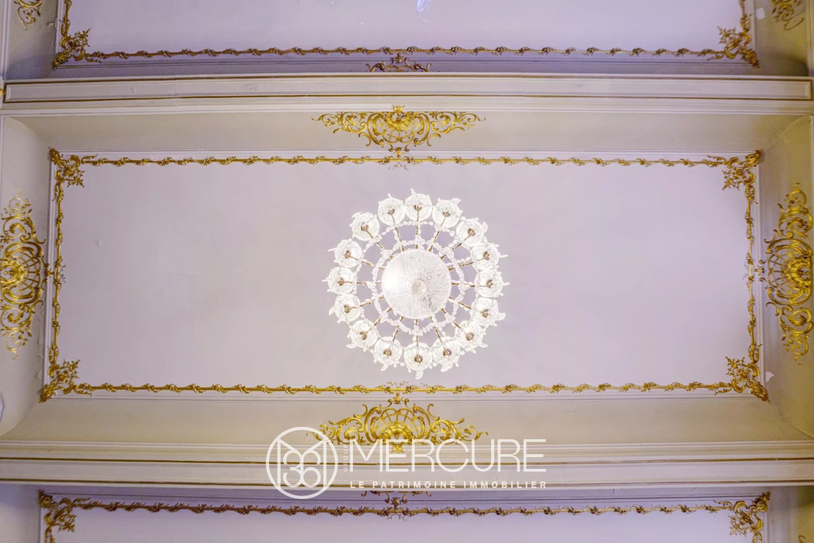 La réception s’organise autour d’un séjour de 65m² aux volumes exceptionnels, évoquant une véritable salle de bal, ouvrant sur un espace destiné à accueillir une vaste cuisine – salle à manger à créer.