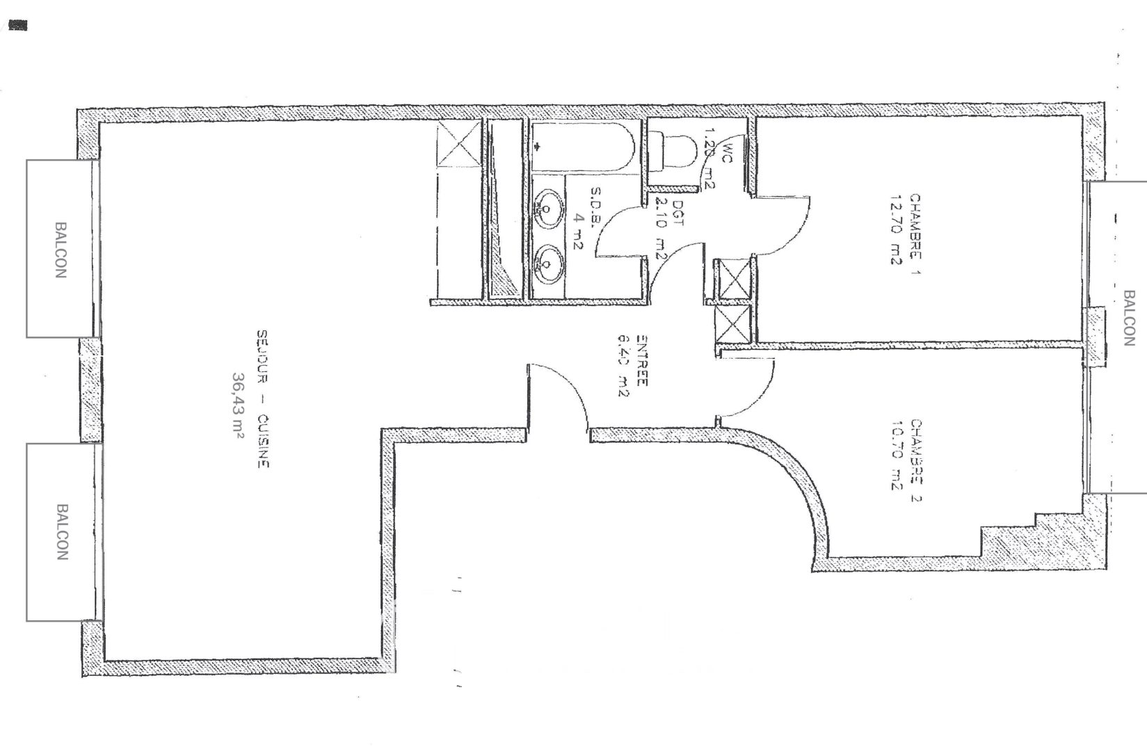 Entrée, pièce de séjour de 36 m² côté rue avec cuisine ouverte et deux baies vitrées ouvrant chacune sur un balcon, deux chambres à l’arrière sur grande cour dégagée, dont une avec balcon-terrasse de 5,40 m², salle de douche, wc indépendant et dégagement avec placards de penderie. En annexe, une cave au sous-sol.