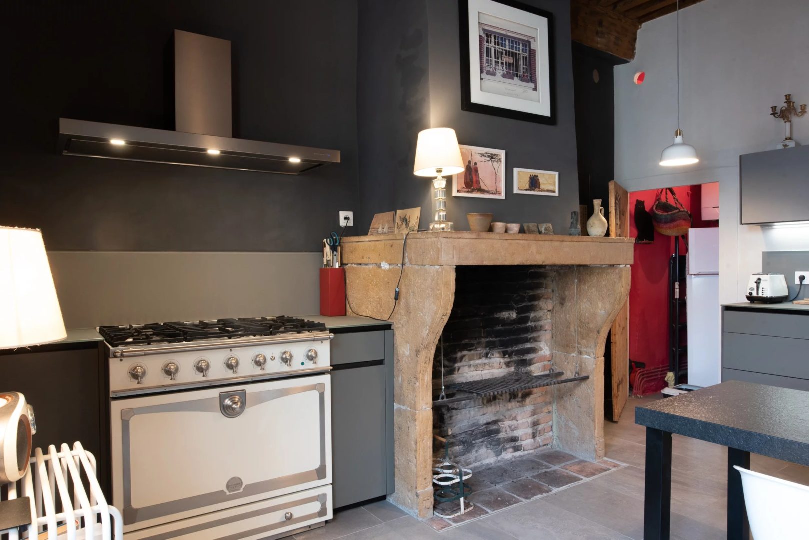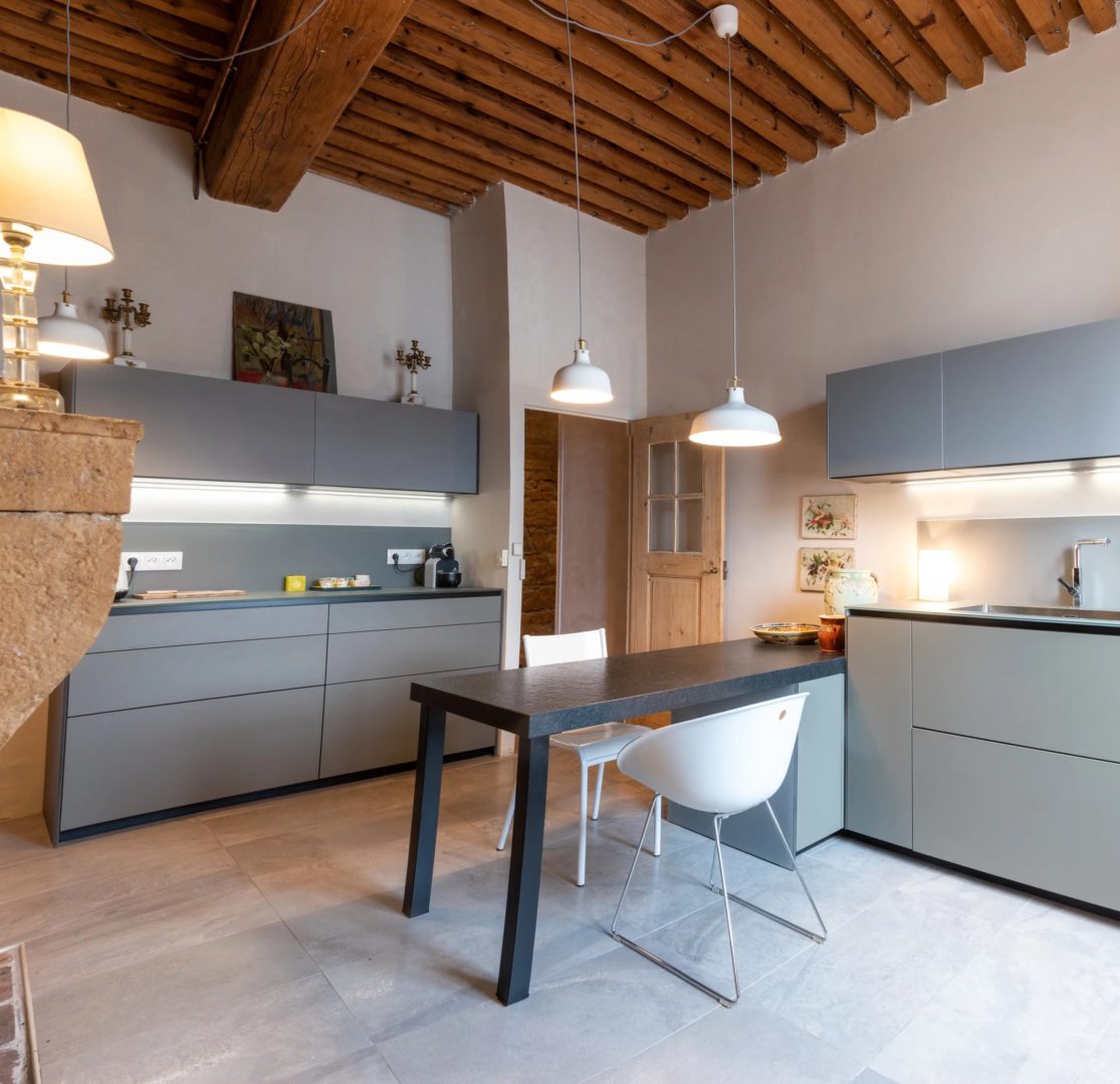 Une très belle cuisine séparée, cuisine équipée ValCucine et piano de cuisson au gaz, avec cheminée, tomettes; une buanderie / cellier et un cagibi jouxtent cette cuisine.