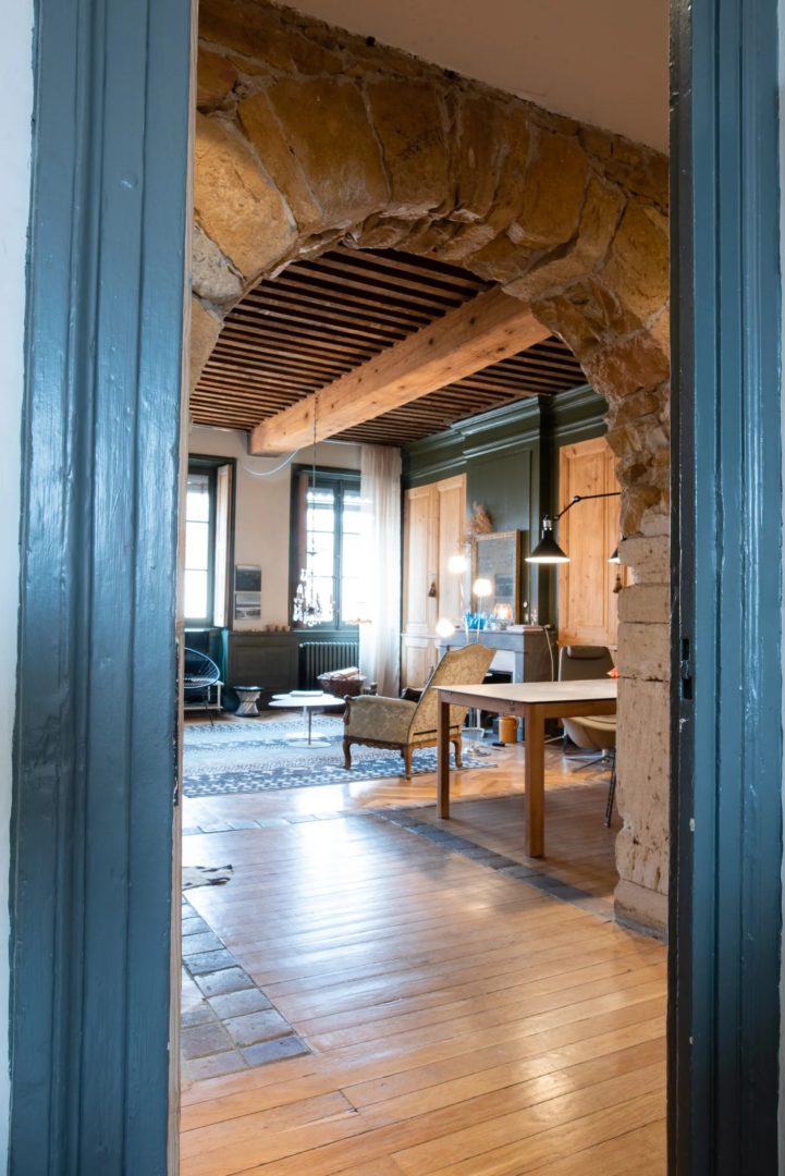 Un grand salon/salle à manger de 47 m² avec cheminée exposé à l’ouest, vue sur les toits de Lyon et Fourvière.