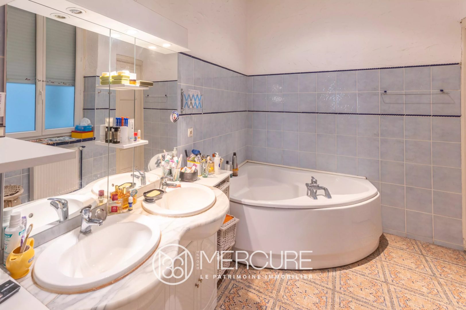Une salle de bains avec baignoire et double vasque.