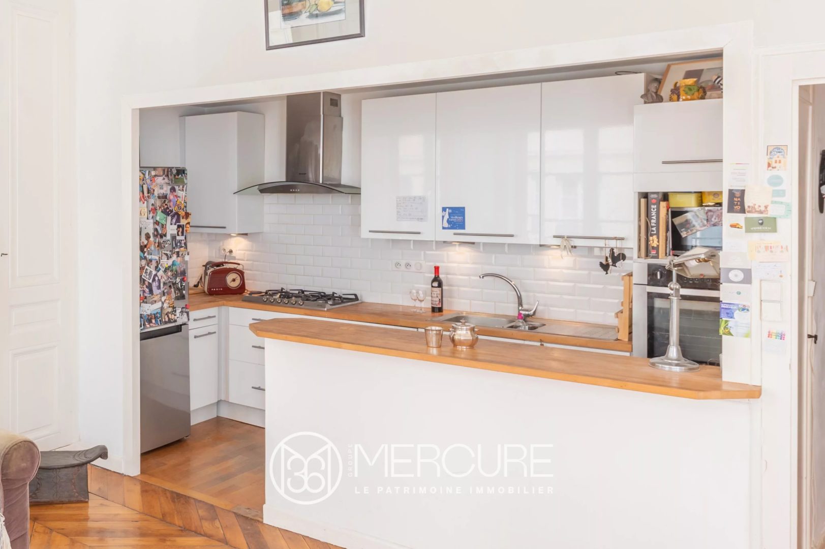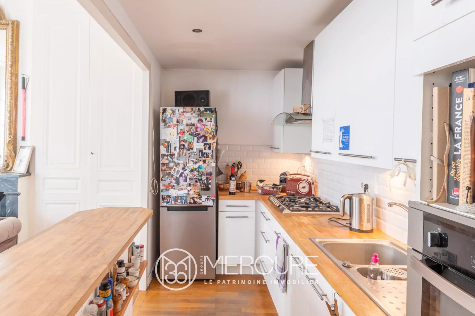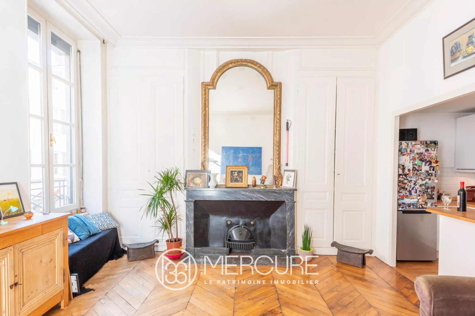 Grande pièce de vie avec cheminée, parquet, boiserie et deux très grandes fenêtres. Très belle luminosité, exposition Est. Cuisine ouverte entièrement équipée.