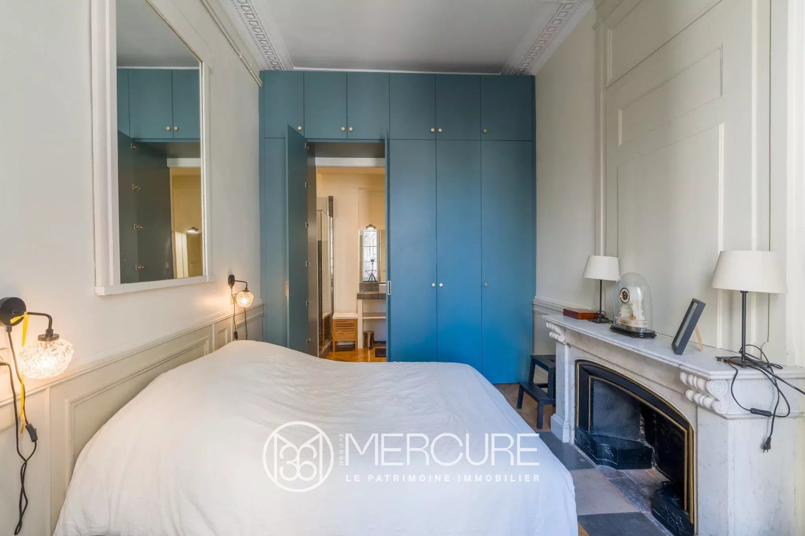 Puis un couloir distribue une salle de bains avec toilette, deux chambres avec chacune mezzanine et escalier aménagé de placards (possibilité pour chaque mezzanine d’une literie 140×190) donnant sur la cour intérieure de l’immeuble, et enfin une belle chambre parentale, exposition est et vue sur la cour du Musée des Tissus, très calme, avec cheminée, espace douche et toilette.