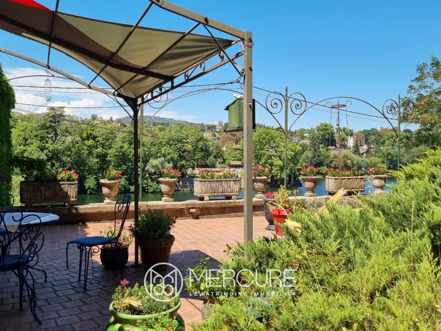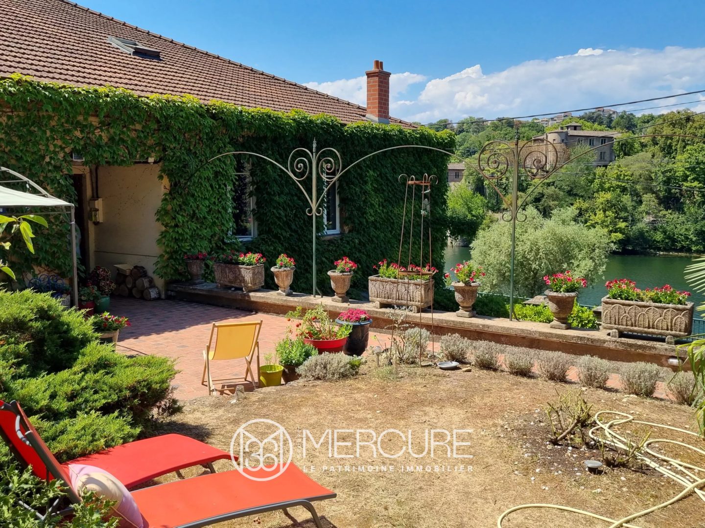 Vaste jardin et terrasse avec vue incomparable sur l’Île Barbe et la Saône à perte de vue.