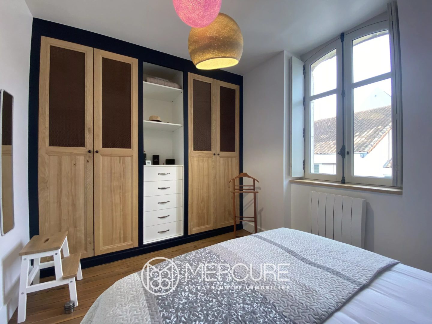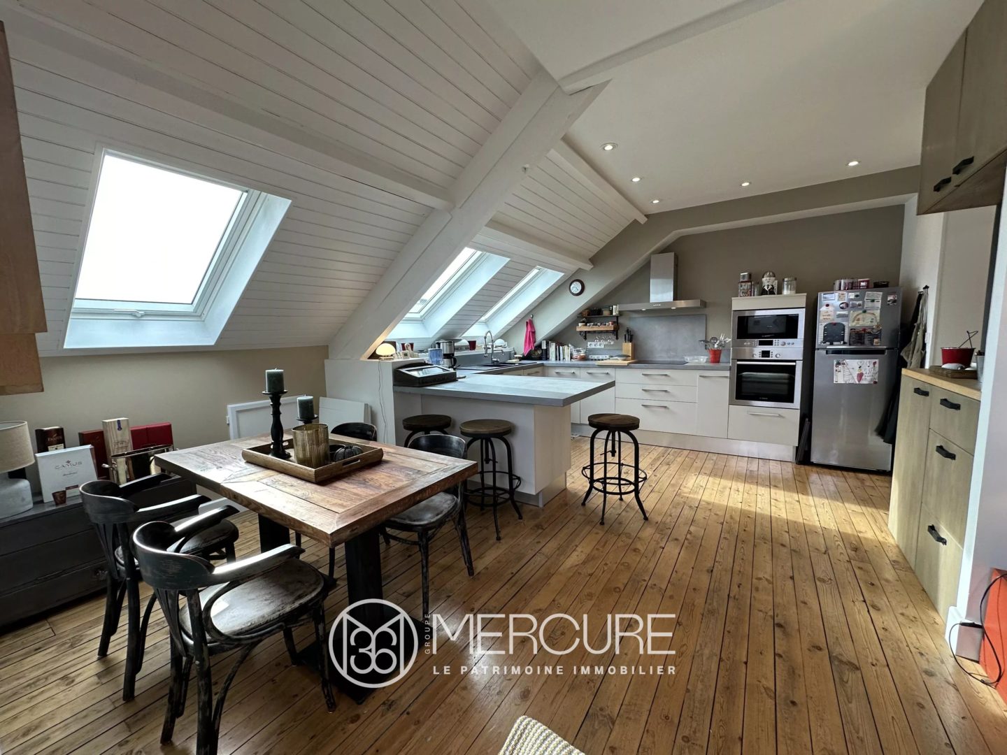 Entrée avec placards sur parquet Sapin, séjour sur parquet Sapin, cuisine aménagée et équipée avec partie repas sur parquet Sapin, water-closet indépendant, deux chambres avec placards, salle d’eau. A l’étage : chambre, salle de bains avec water-closet, grenier. Cave.
