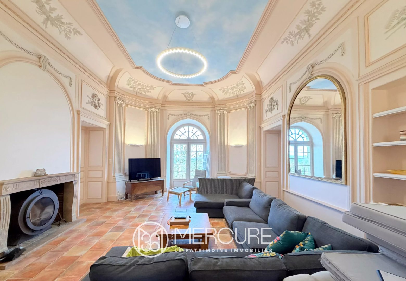 Une belle entrée dessert un vaste salon lumineux avec moulures décoratives et cheminée, ouvert sur une grande terrasse avec vue dégagée sur la campagne et la piscine.