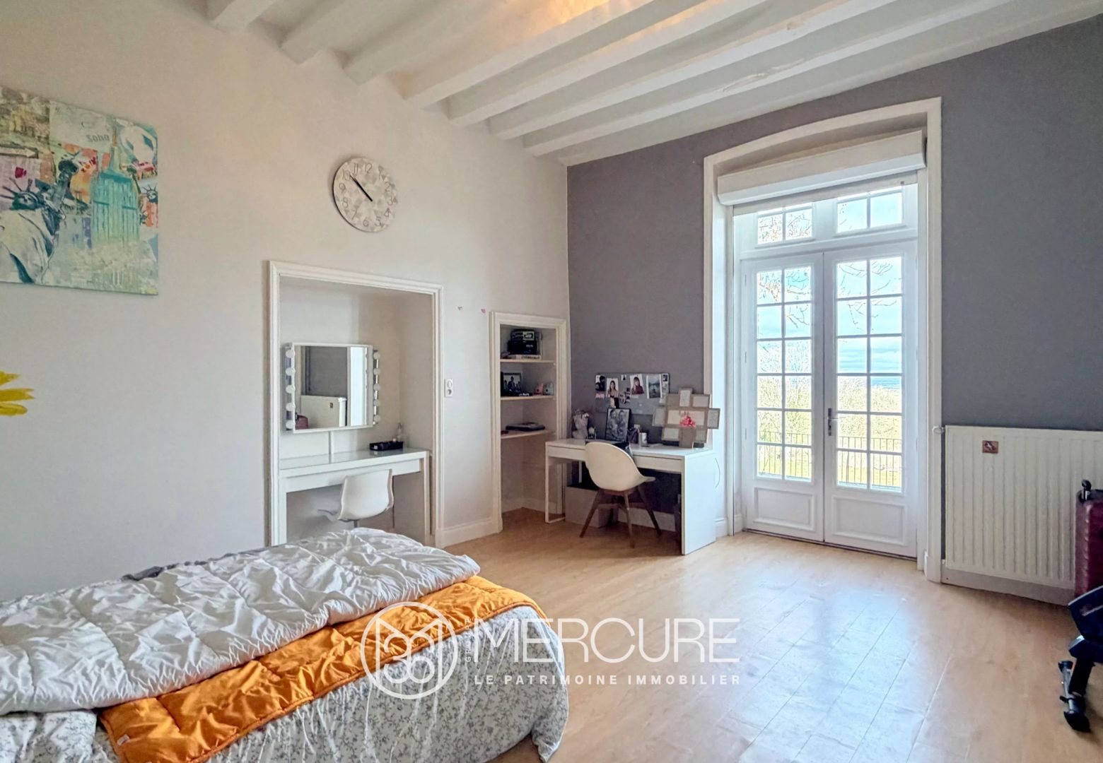 Belle hauteur sous plafond avec poutres apparentes et menuiseries anciennes en double vitrage.
