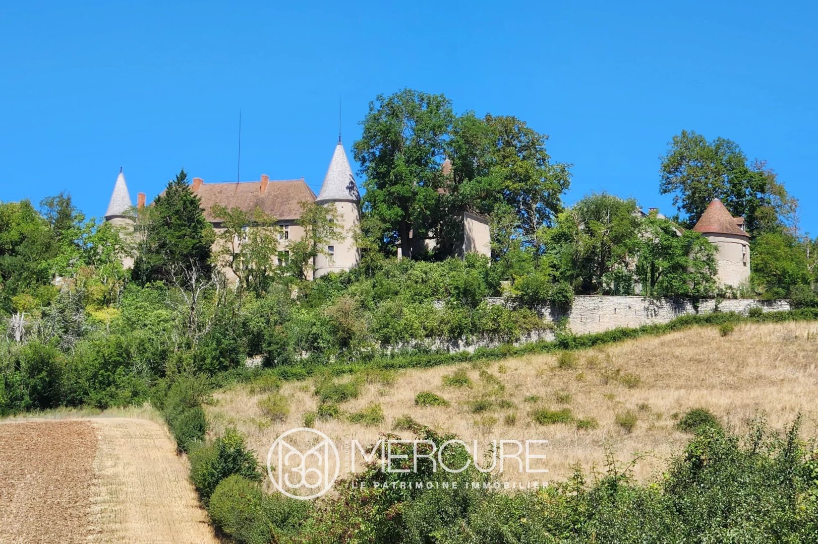 Le terrain de près de 4,8 hectares est partiellement clos, notamment par des murs en pierre. Il comprend un jardin potager et un verger d’environ 5 000 m², ainsi que des prairies s’étendant sur environ 1,5 hectare. Deux grandes terrasses situées à l’avant du château offrent une vue spectaculaire sur la vallée et renforcent le caractère unique des lieux.