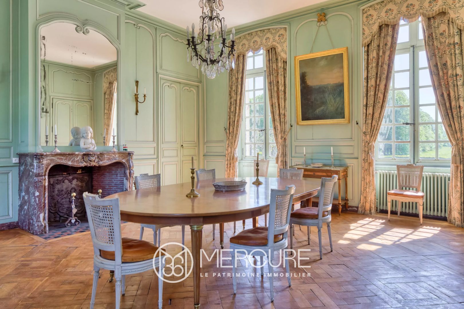 – La salle à manger (40 m² environ) : ses boiseries Louis XV aux teintes vert d’eau et sa cheminée de marbre rouge invitent à profiter d’un dîner raffiné.