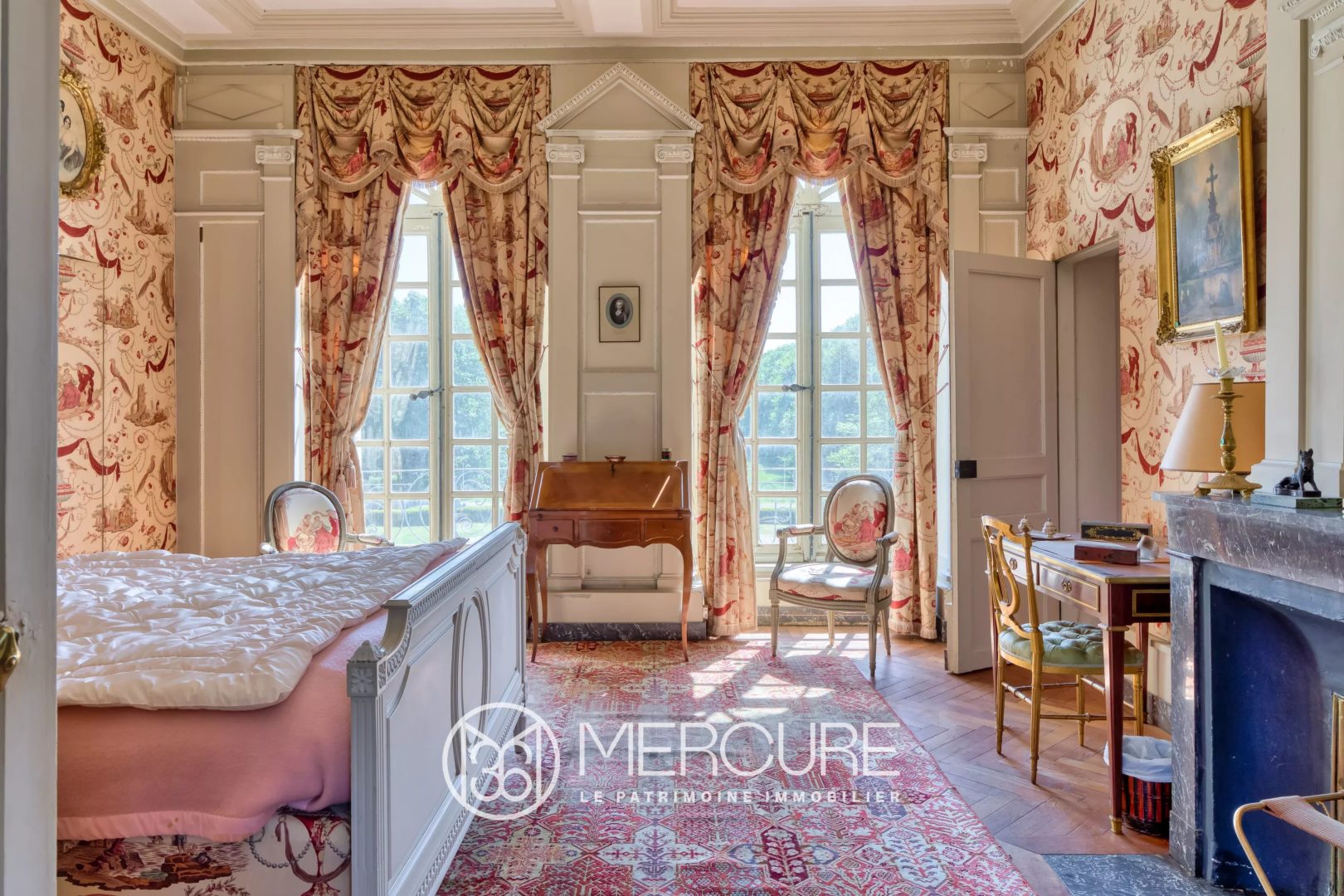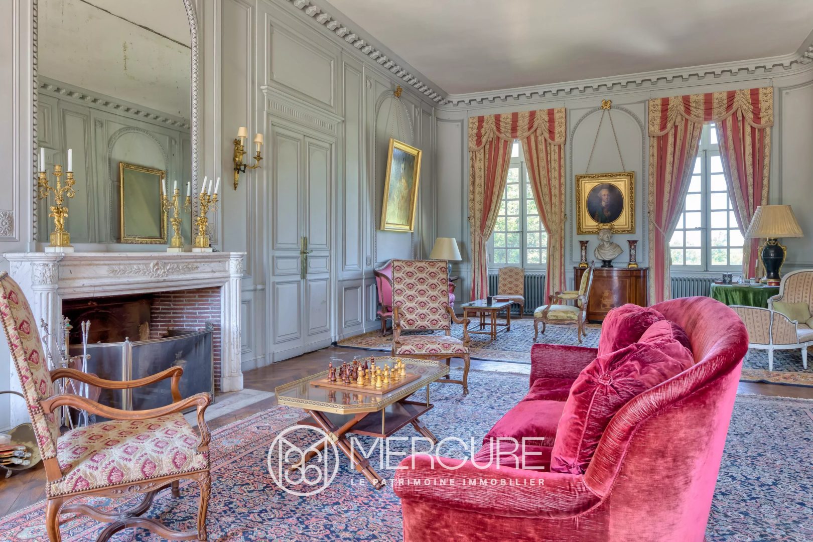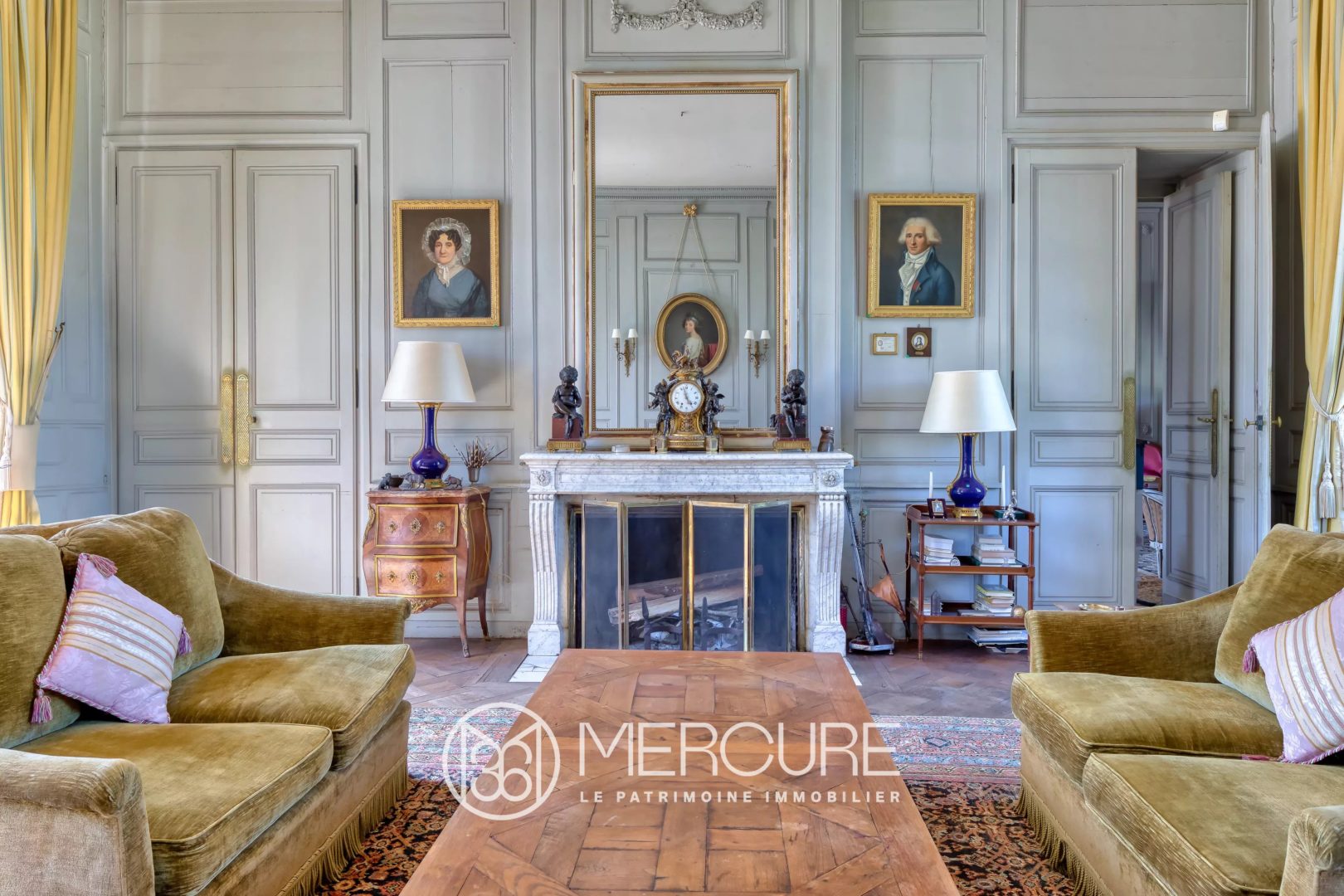 – Le petit salon (40 m² environ) : en lumière traversante également par quatre fenêtres en face à face, ce chaleureux salon à feu est tourné vers sa superbe cheminée de marbre Louis XVI, surmontée d’un trumeau en miroir. Le sol est en parquet dit « petit Versailles ».