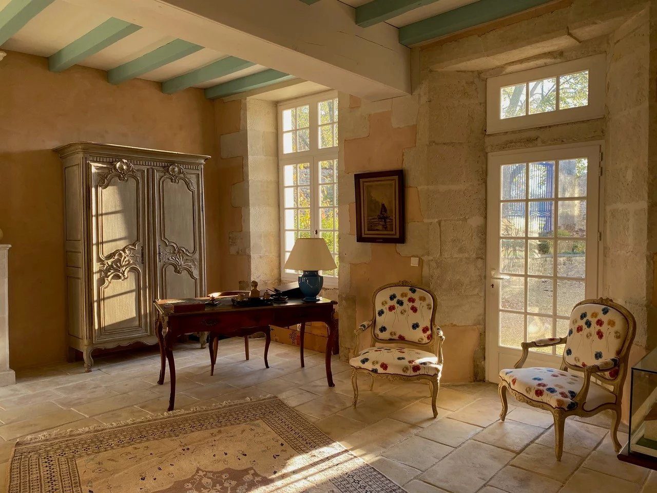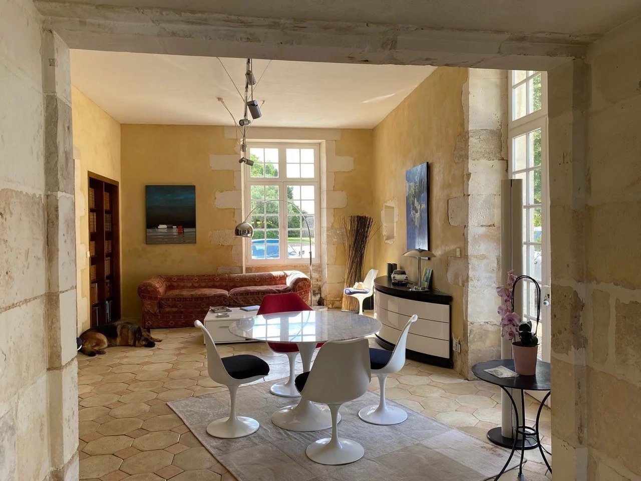 – Grand salon avec dallage pierre et belle cheminée