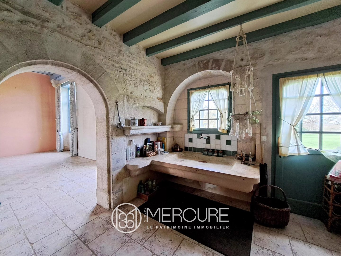 Le logis principal, d’environ 500 m², séduit par une distribution fluide et élégante, sublimée par de beaux volumes et une luminosité omniprésente. Le rez-de-chaussée s’organise autour d’une entrée traversante de caractère. Le salon de réception de près de 60 m², agrémenté d’une majestueuse cheminée, constitue un espace privilégié pour les réceptions et les moments de convivialité. La cuisine, dotée d’un superbe évier en pierre, se prolonge par une vaste arrière-cuisine ; une lingerie complète cet espace fonctionnel. Salon de musique, salon de jeux, bureau, ainsi que deux chambres avec salle d’eau viennent parfaire ce niveau. À l’étage, un vaste palier dessert six chambres, deux salles d’eau et une salle de bains.