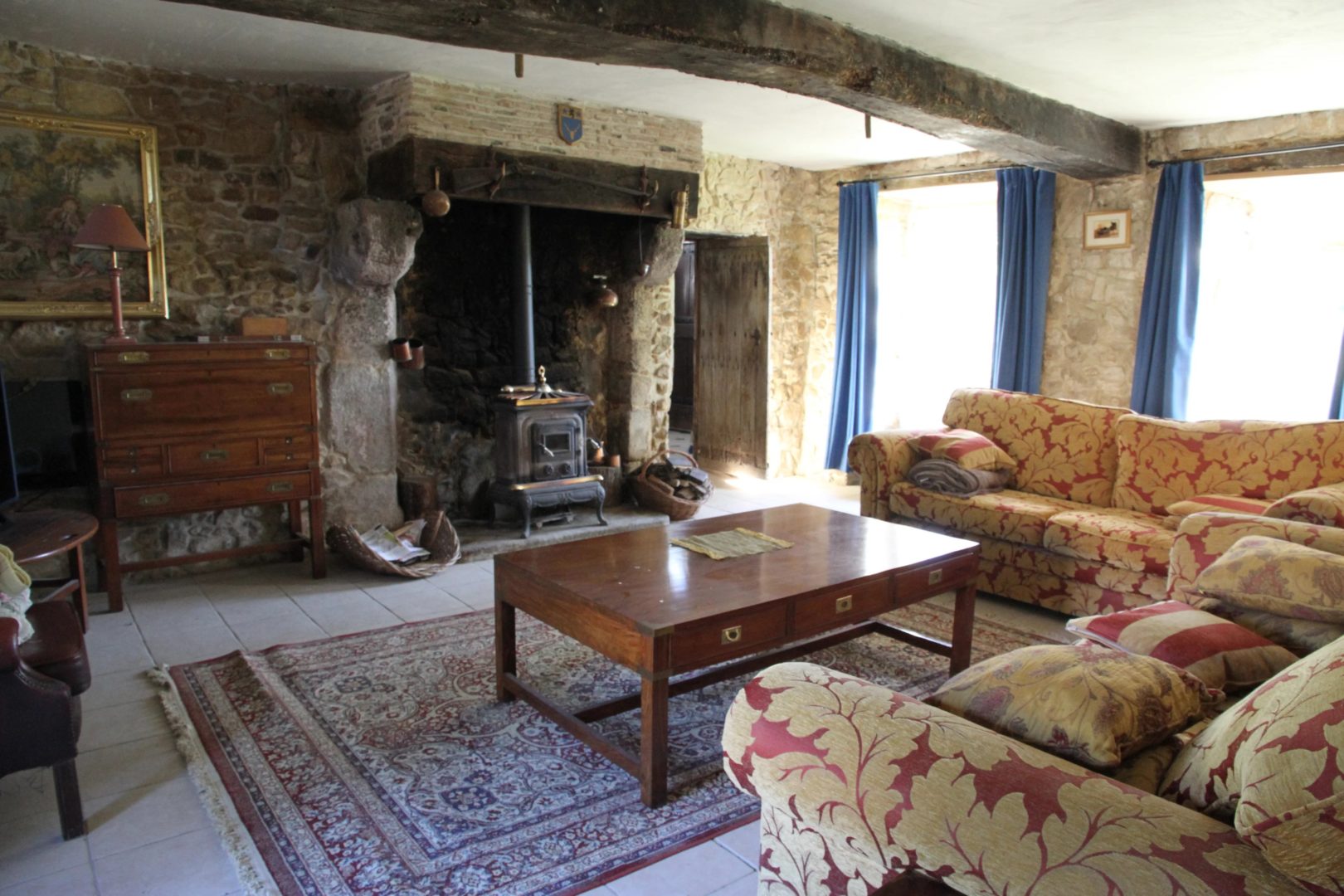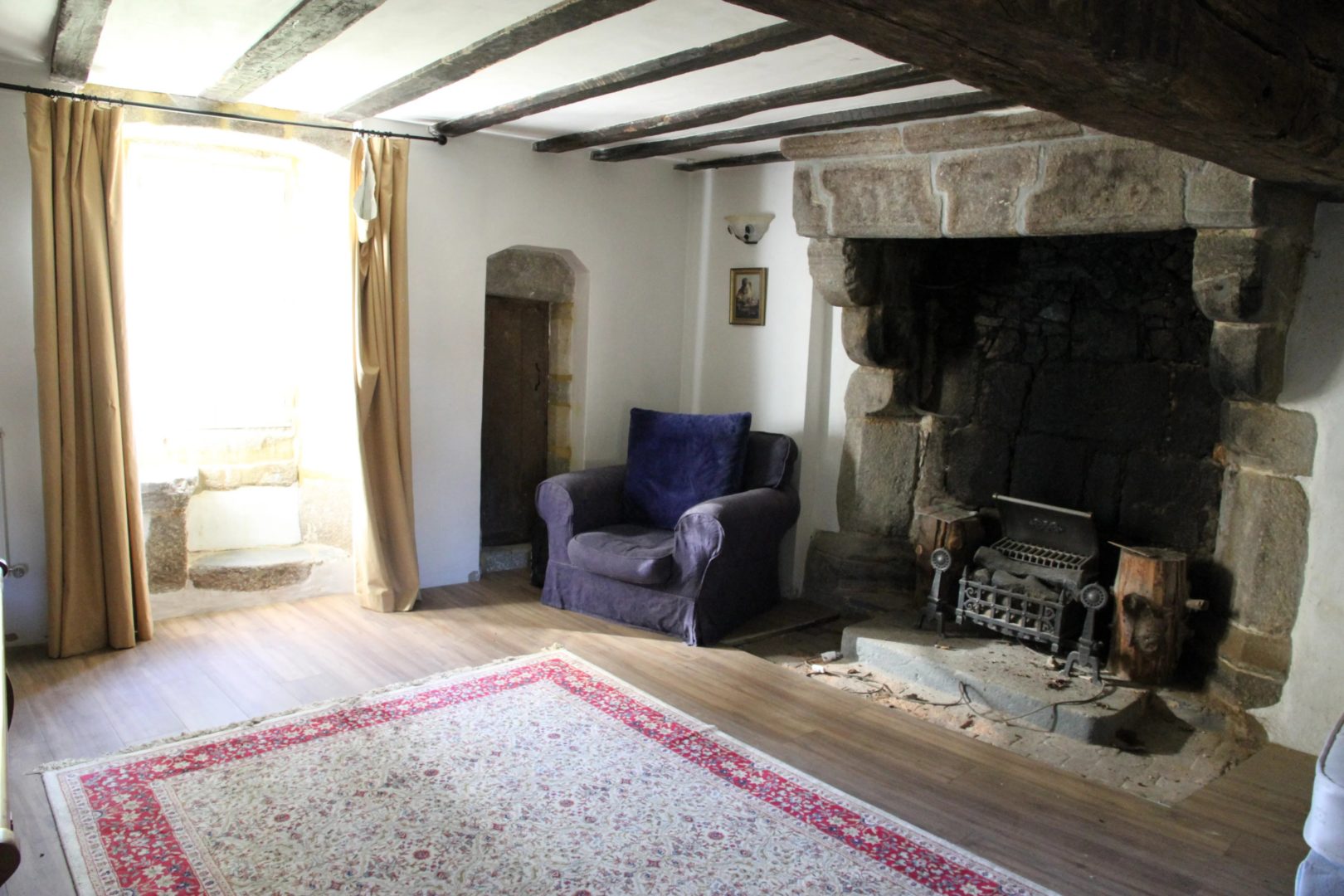 – Salon avec cheminée monumentale et murs en pierre (27,9 m²)