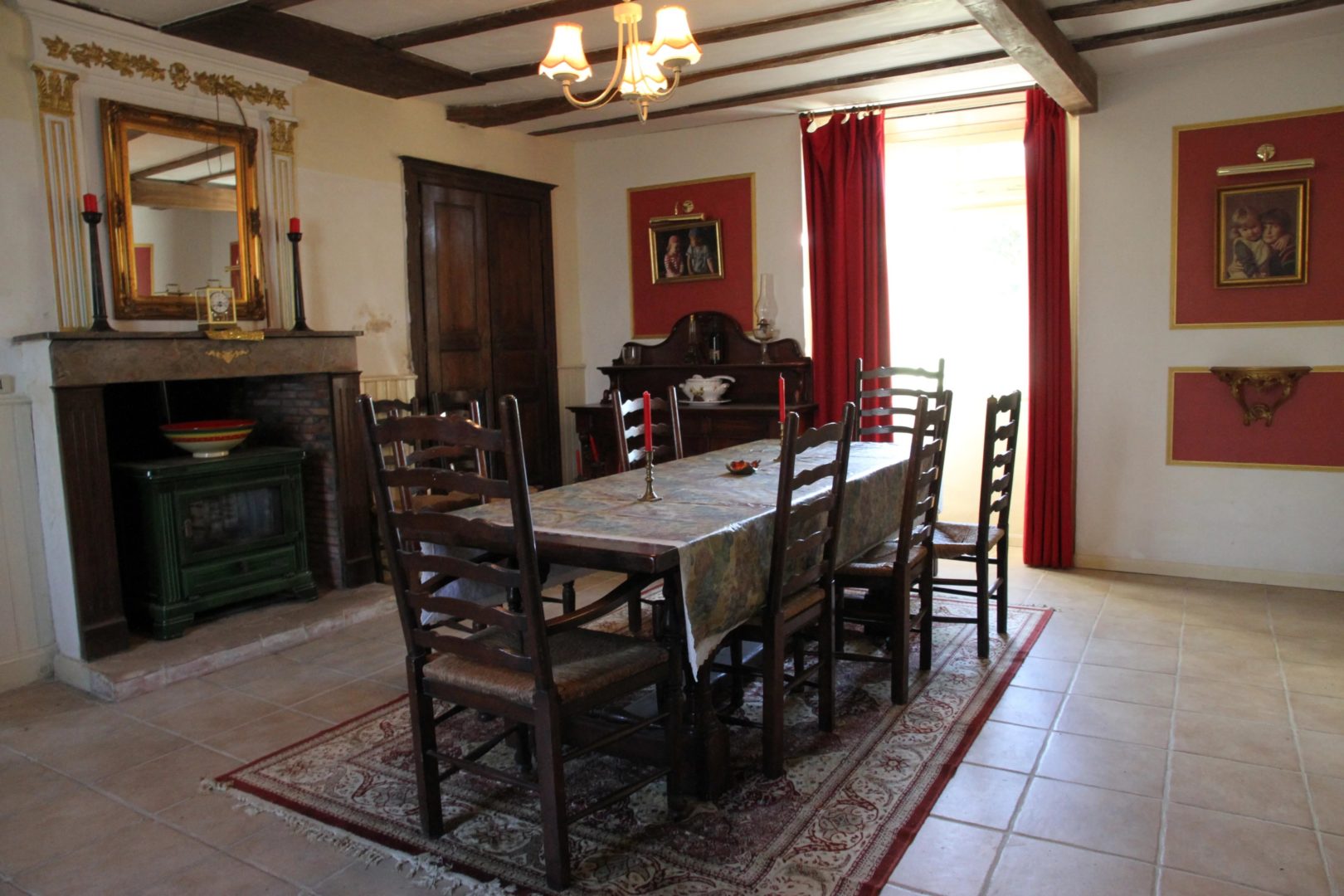 – Salle à manger avec cheminée avec poêle et poutres (26,6 m²)