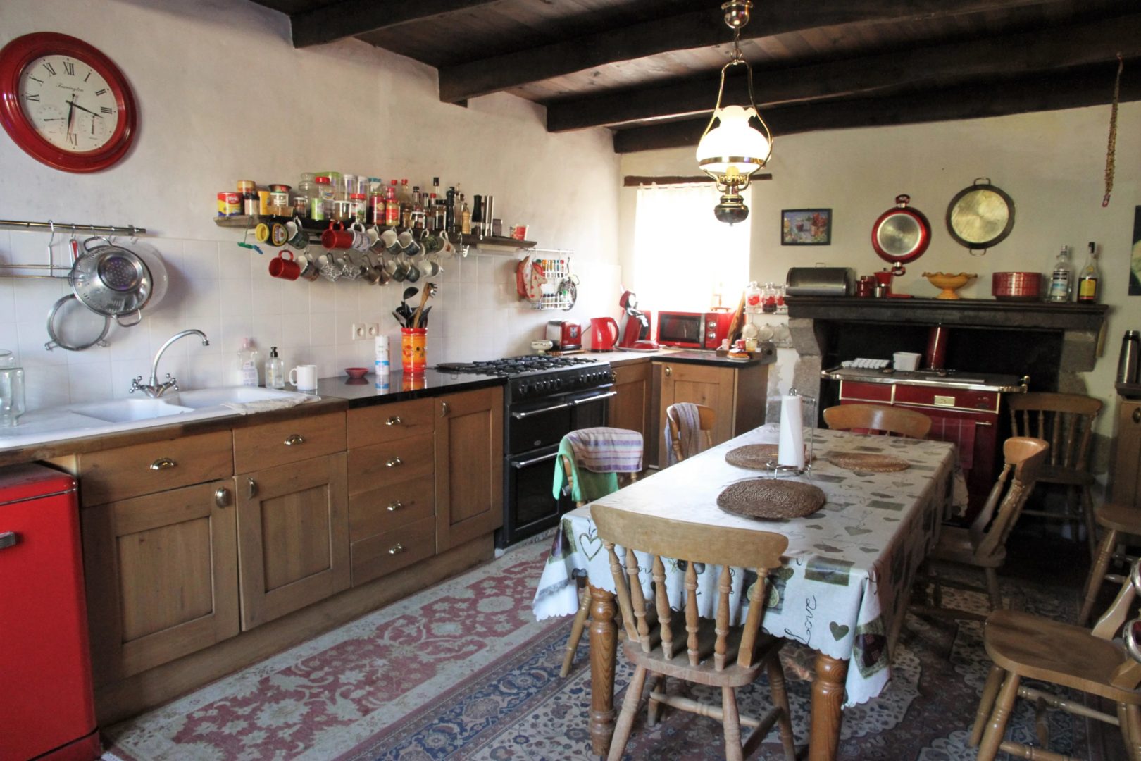 – Cuisine aménagée (piano gaz et cuisinière bois) sur tomettes avec poutres et cheminée (22,6 m²)