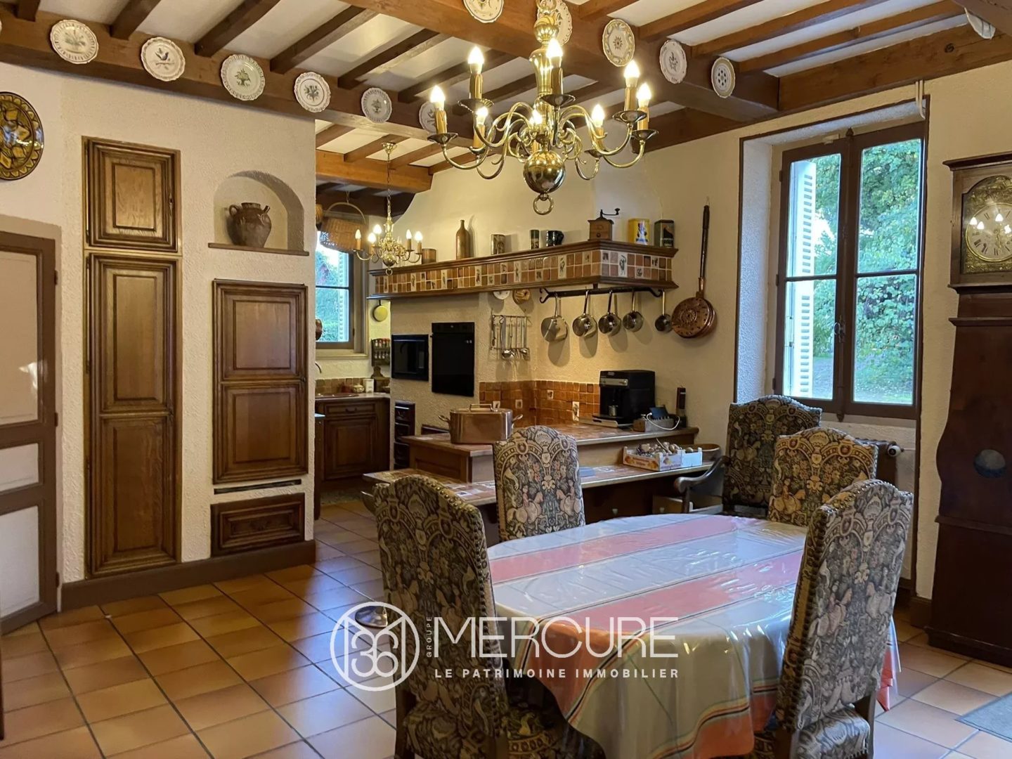 Dotée de pièces majestueuses aux belles proportions, la demeure s’élève sur trois niveaux. Le rez-de-chaussée accueille les pièces de réception. Une entrée, sur sol en carreaux de ciment d’origine, dessert le salon, sur parquet de chêne ciré, avec cheminée en marbre et plafond mouluré agrémenté de décors, et son boudoir dans la tourelle. La salle à manger est traversante et offre une belle cheminée, sur parquet chêne. Un bureau a pris place dans l’ancien oratoire au sol en chêne ciré et au plafond en voûte d’ogive. Pour compléter ce niveau, des toilettes avec lave-mains sur sol en terre cuite, une cuisine dinatoire équipée et aménagée, sur carrelage de Bavière, avec cheminée en pierre équipée d’un poêle, et la lingerie-chaufferie, sur sol terre cuite.