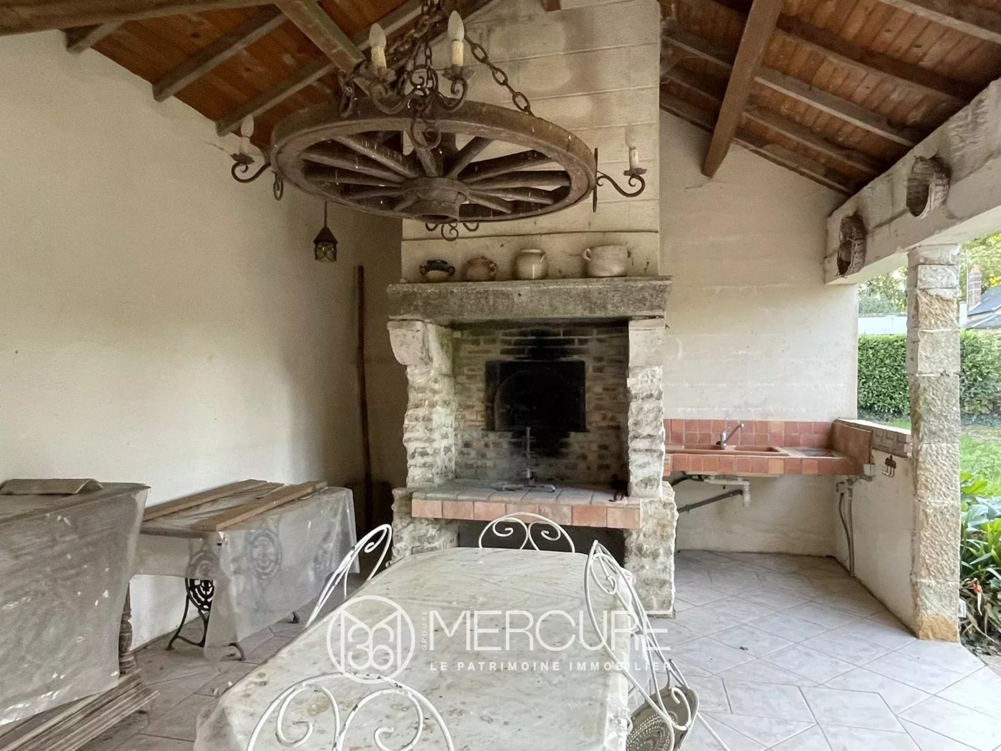 Parmi les dépendances, vous trouverez un préau /salle à manger d’été équipé d’une cheminée /grill et four à pain, d’un potager ancien et d’un évier.