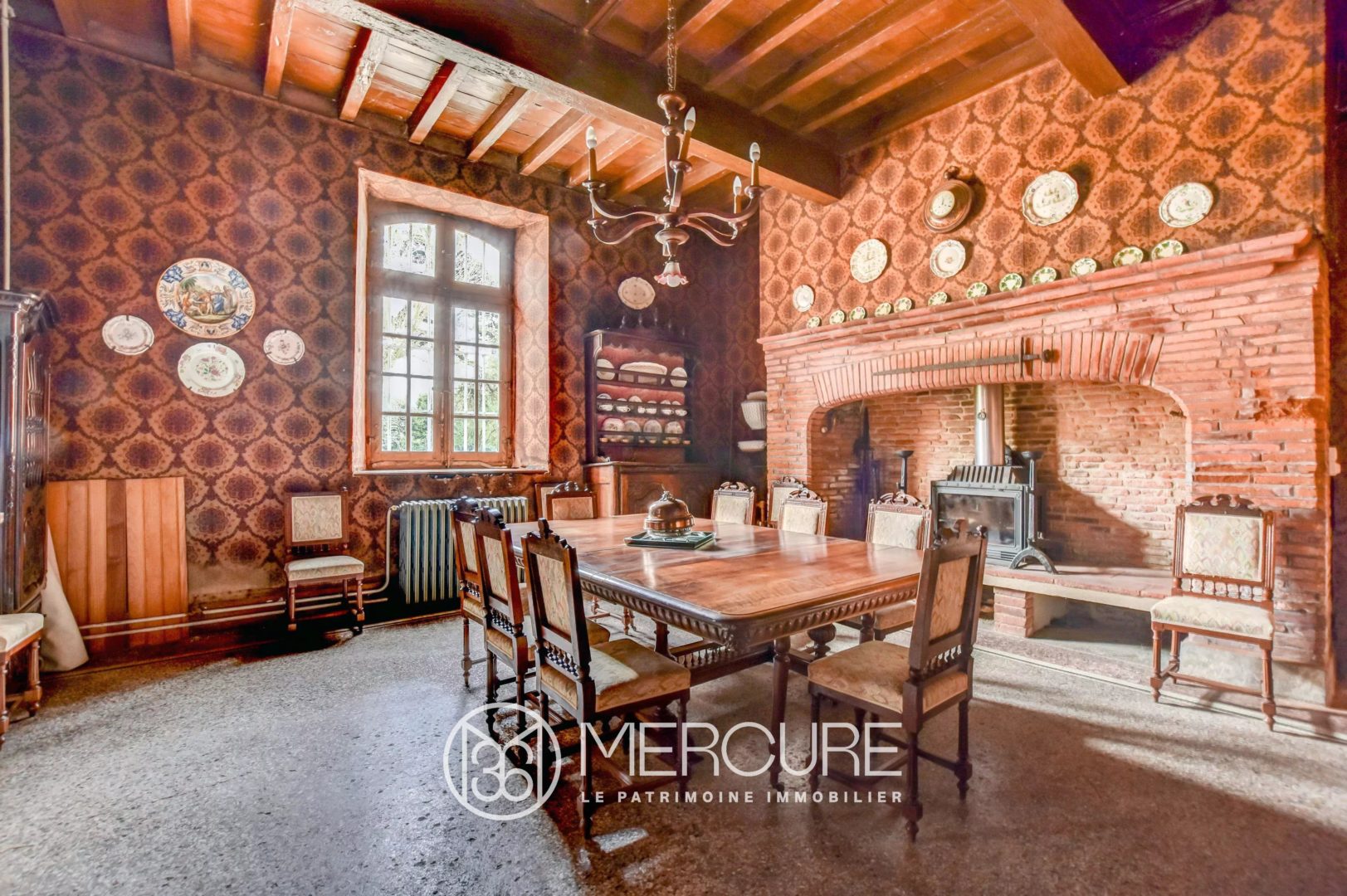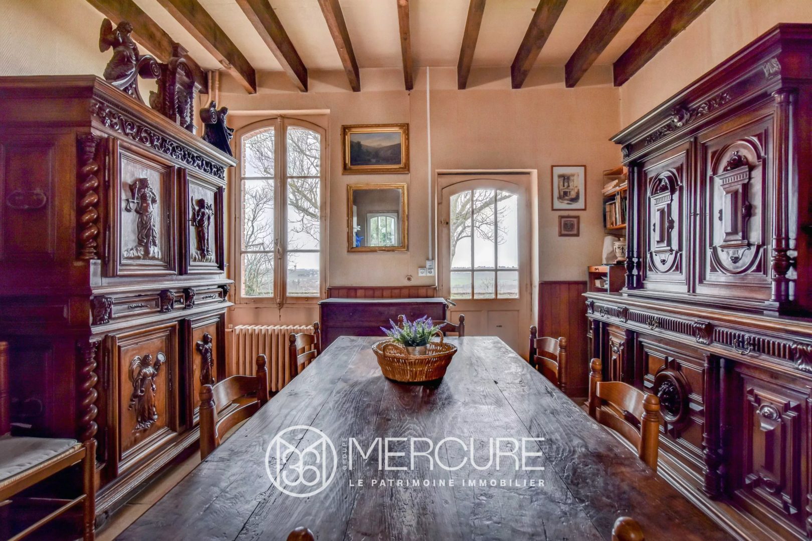 Au rez de chaussée, un hall traversant dessert un grand salon, un bureau situé dans une des deux tours, le petit salon. Petite chambre dans la seconde tour, salle à manger et sa belle et grande cheminée en brique avec un insert. Palier avec escalier en bois donnant accès au premier étage.