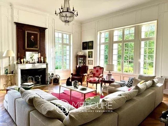 Vers le sud-ouest, un salon lumineux de 45 m², constitué d’une larges baies vitrées, offre une belle ouverture sur l’extérieur. Le sol en parquet point de Hongrie et la cheminée en marbre apportent à la pièce une grande élégance et une atmosphère chaleureuse, tandis que la hauteur sous plafond de 4 mètres accentue le sentiment d’espace