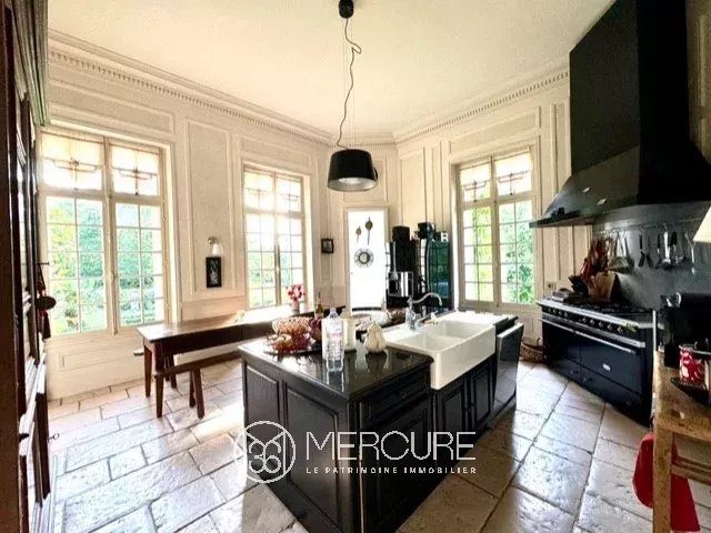 La cuisine, spacieuse et fonctionnelle avec ses 30 m², est dotée d’un sol en pierre naturelle, d’un îlot central et d’un piano de cuisson. Elle s’ouvre sur une tour, offrant un accès direct au parc et une transition harmonieuse entre intérieur et extérieur.