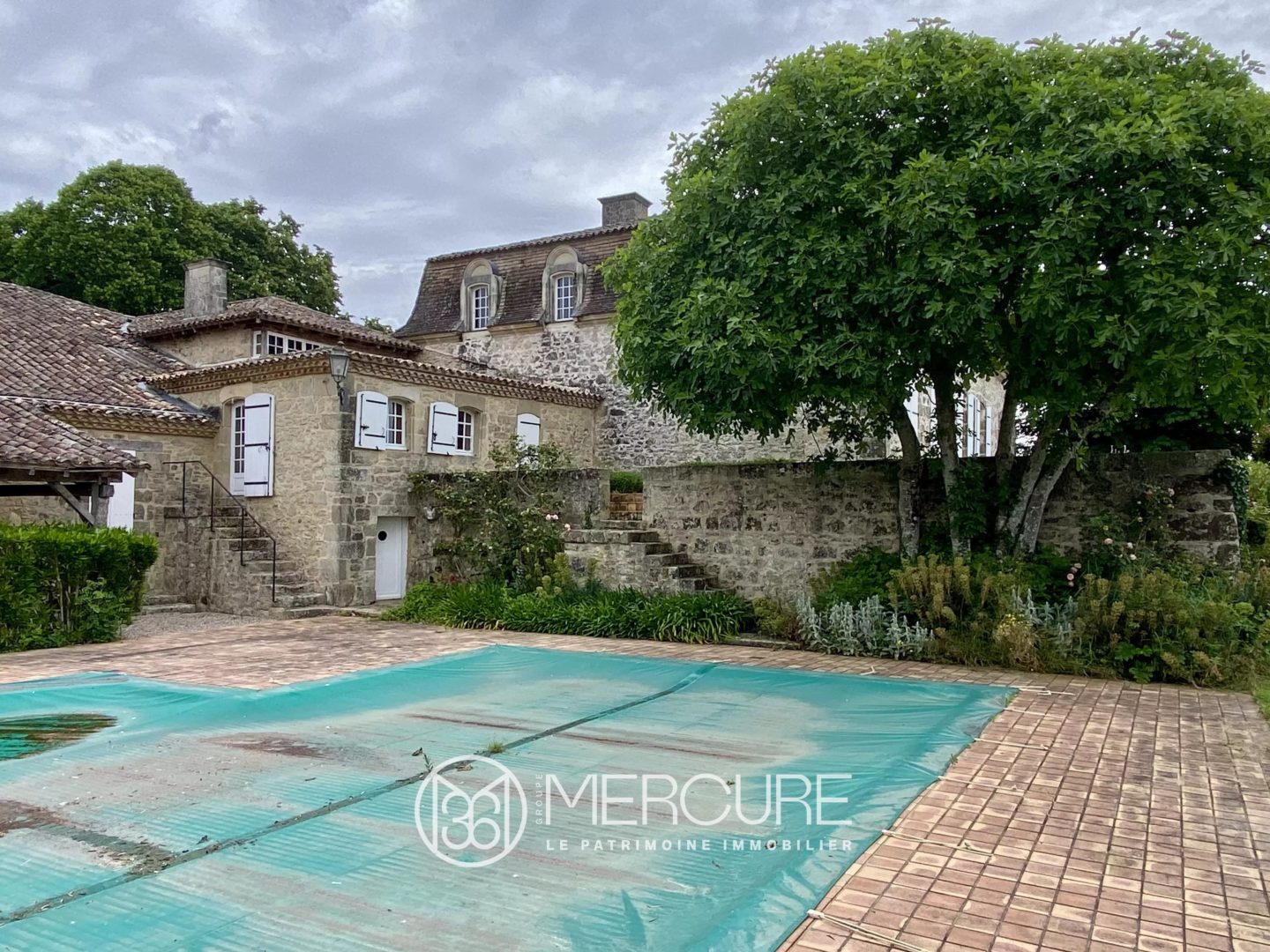 [en option pour 300 000 €, une exploitation agricole de 25ha affermée avec des bâtiments d’exploitation nécessitant une restauration complète : maison, hangar et séchoir à tabac, piscine]
