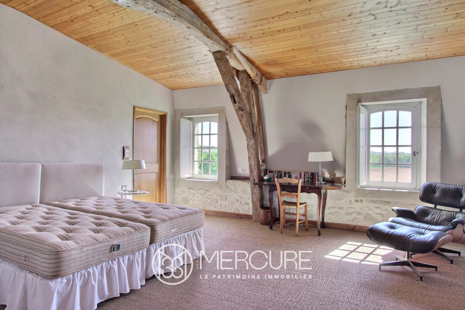 Le château, grande maison en pierre élégante couverte d’un toit à la Mansart, dispose sur trois niveaux de huit chambres, deux salons, deux salles à manger, quatre salles de bains et deux salles d’eau.