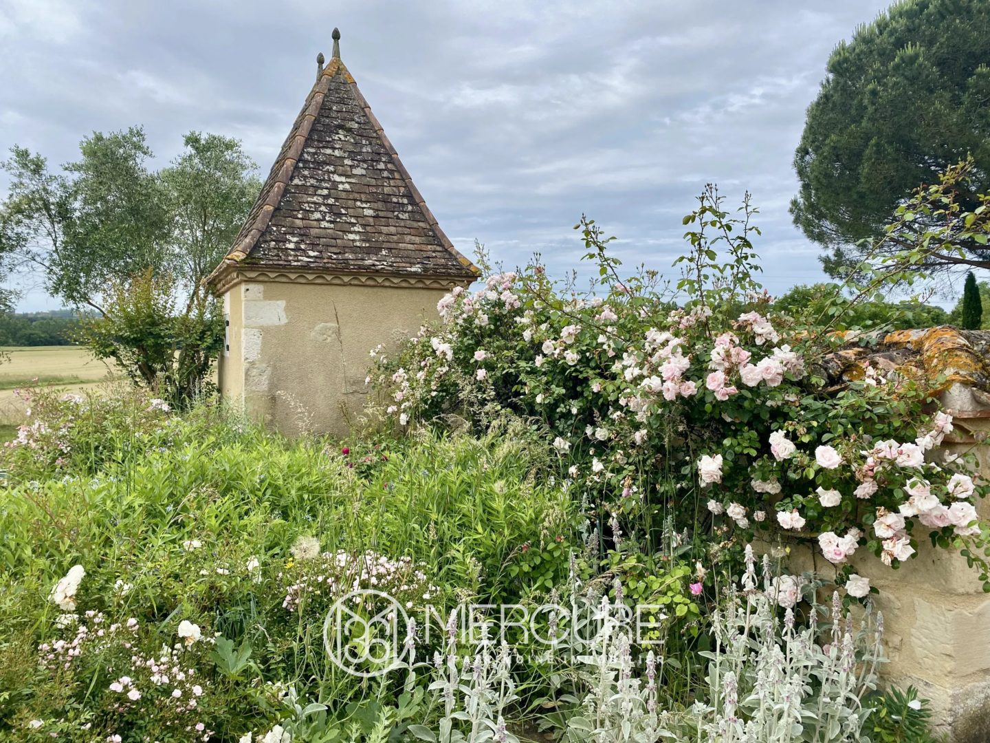 Le jardin offre deux terrasses dont une couverte avec barbecue, un jardin d’herbes aromatiques et un potager donnant sur les champs, une piscine. Un peu plus loin, un jardin plus vaste, des allées ombragées, un verger, un grand pigeonnier, traditionnel dans la région, pouvant servir de box pour un cheval, de bûcher, d’atelier ou de poulailler. Plus loin encore le court de tennis.
