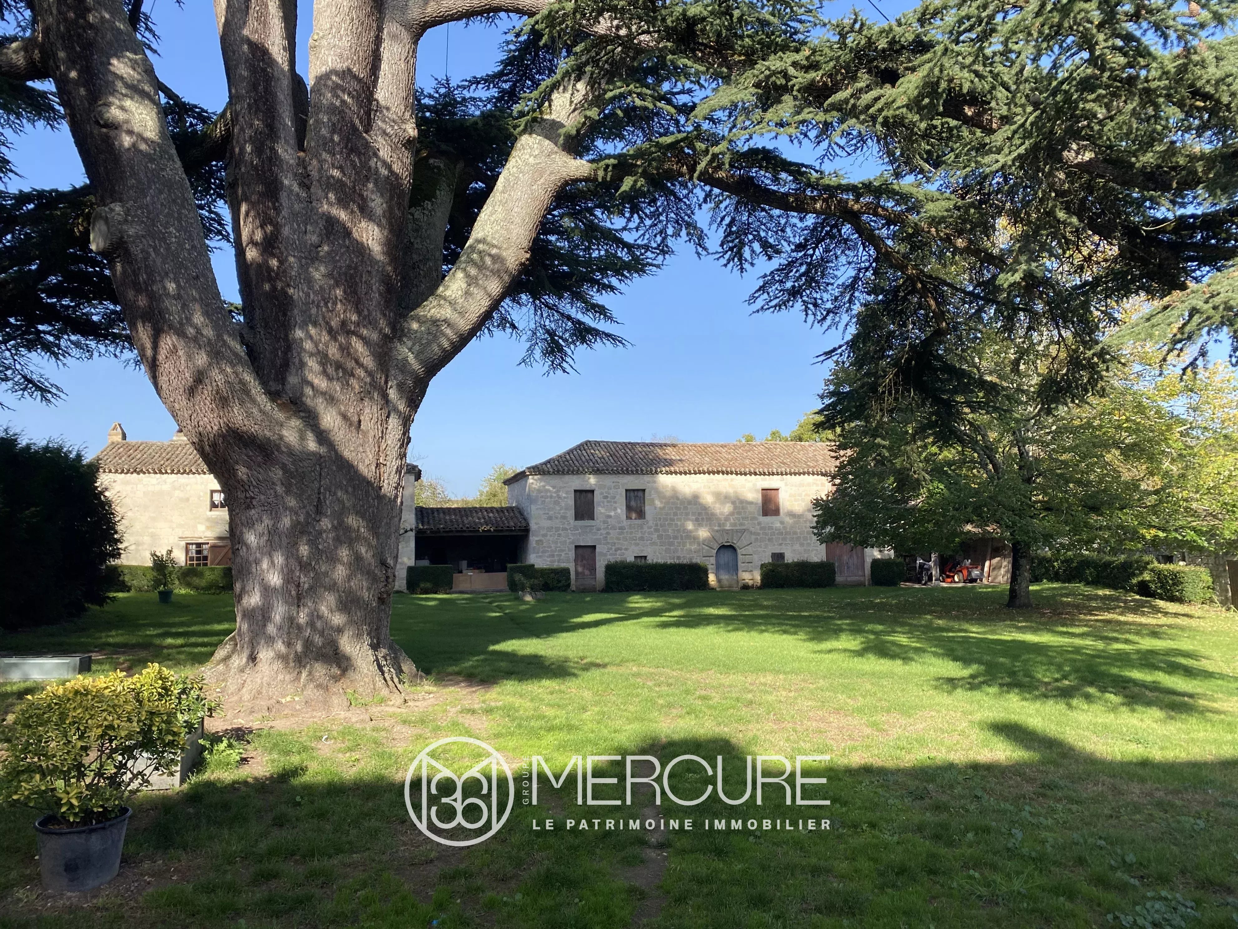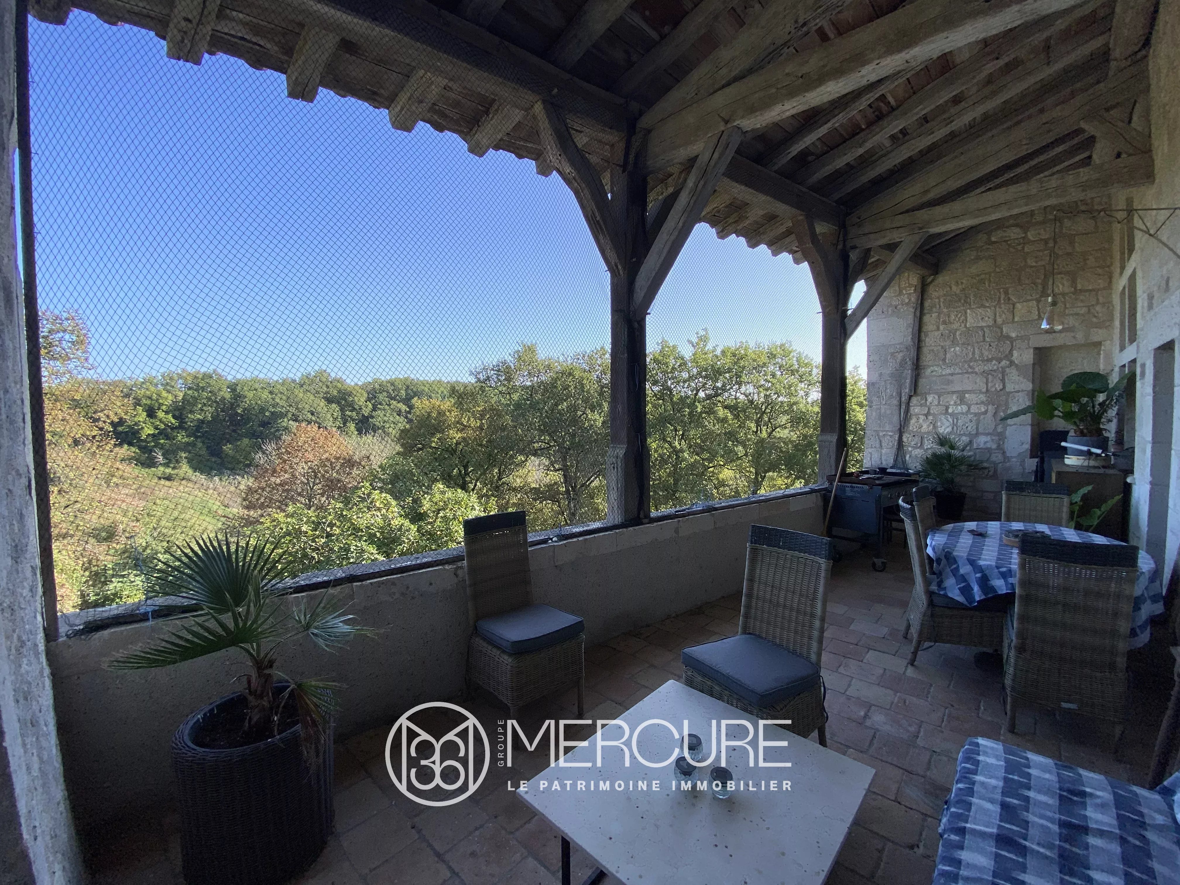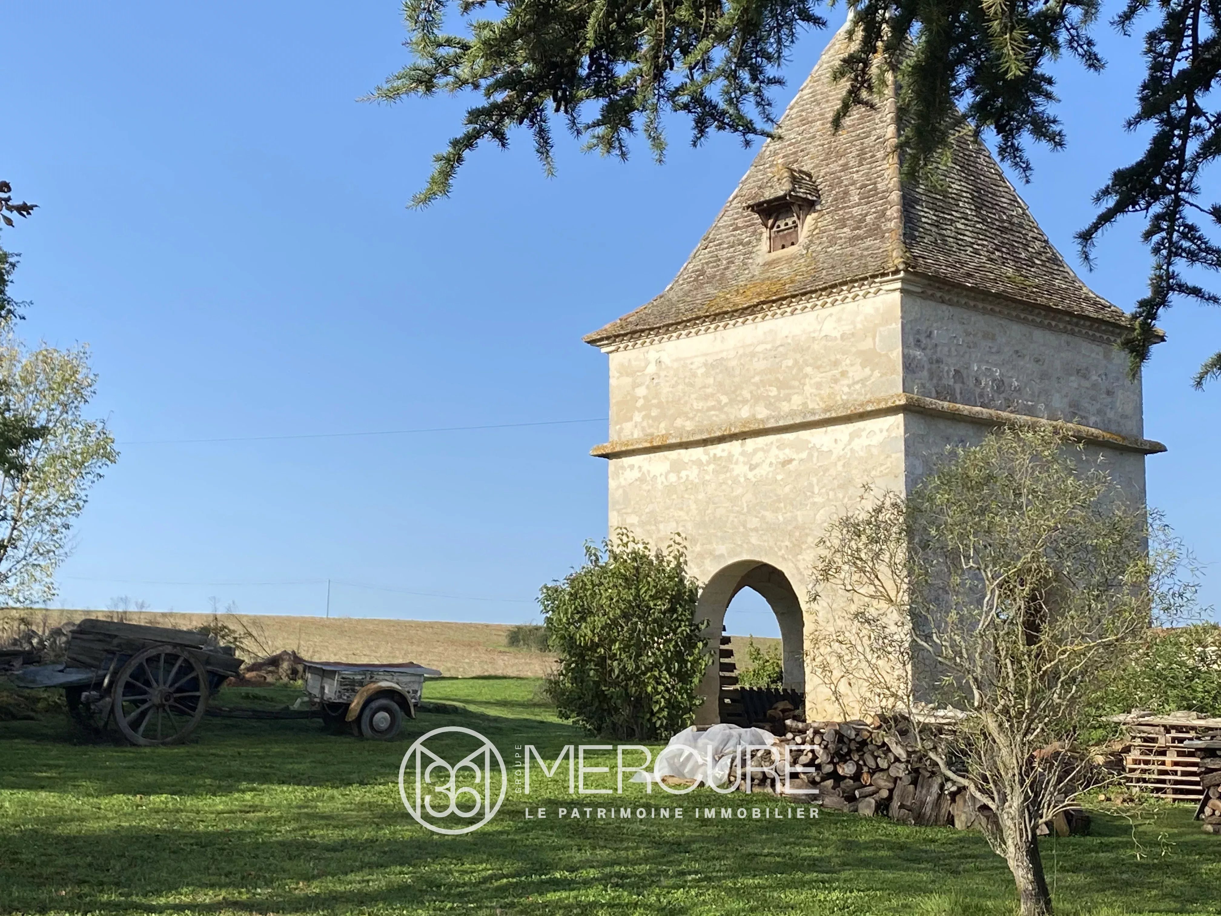 Organisé autour d’une élégante cour intérieure, l’ensemble comprend le château principal, une maison de gardien, d’anciens communs (écuries), une chapelle restaurée, un pigeonnier, un bûcher, et même les vestiges d’un moulin à vent qui veillait autrefois sur la crête. L’ensemble s’étend sur un domaine de 3 hectares 64 ares (dont une plantation de chênes truffiers) structuré comme un petit monde clos, paisible et complet.