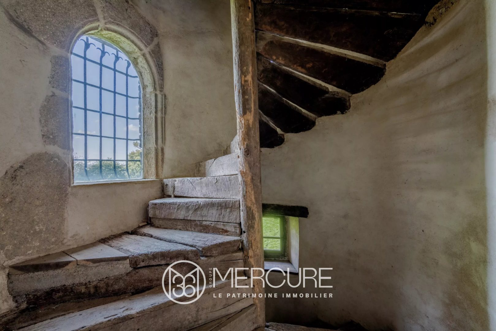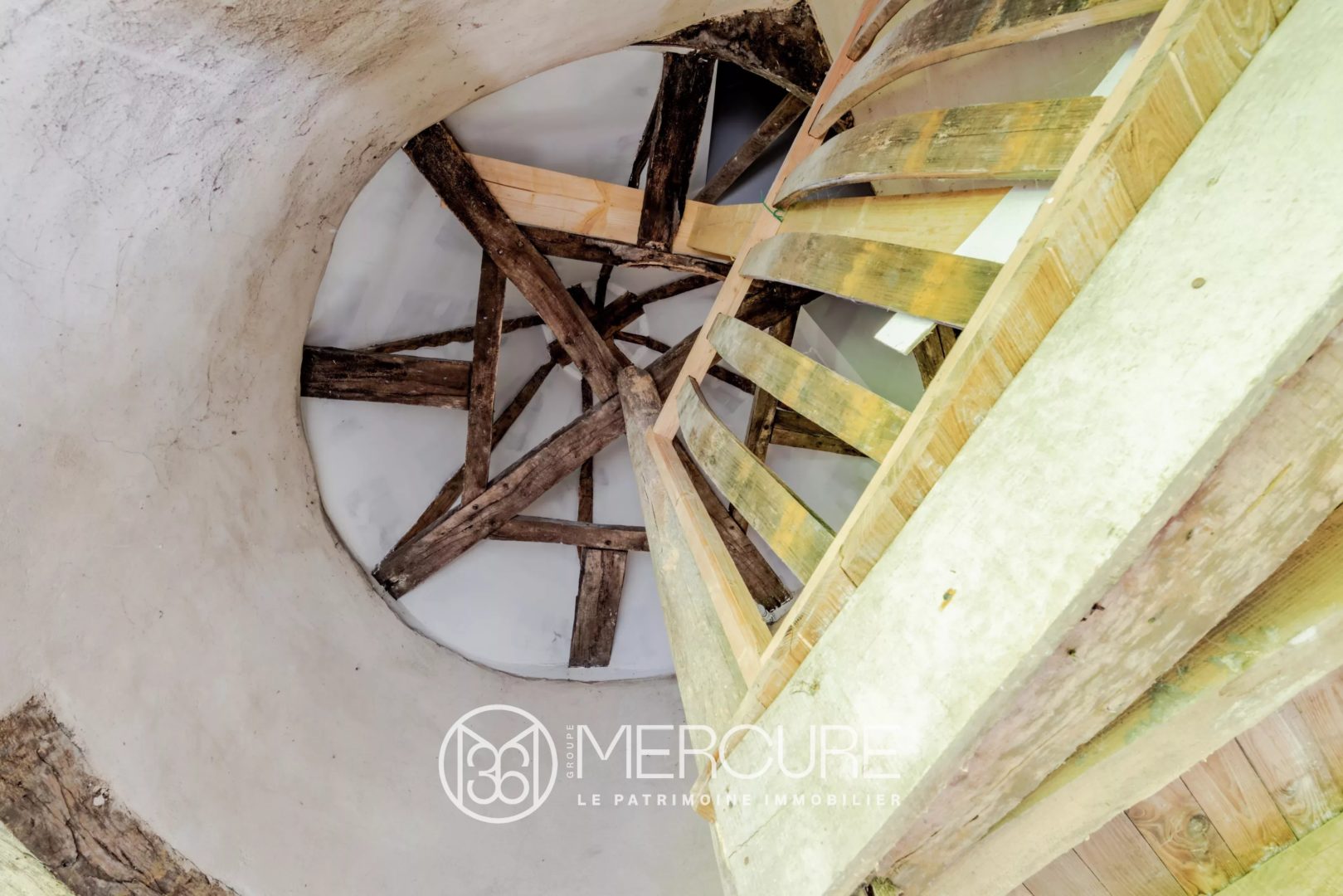 L’imposant escalier à vis en chêne massif mène à la chambre de maître, parfaitement conservée avec son parquet, sa cheminée et ses poutres d’origine.
