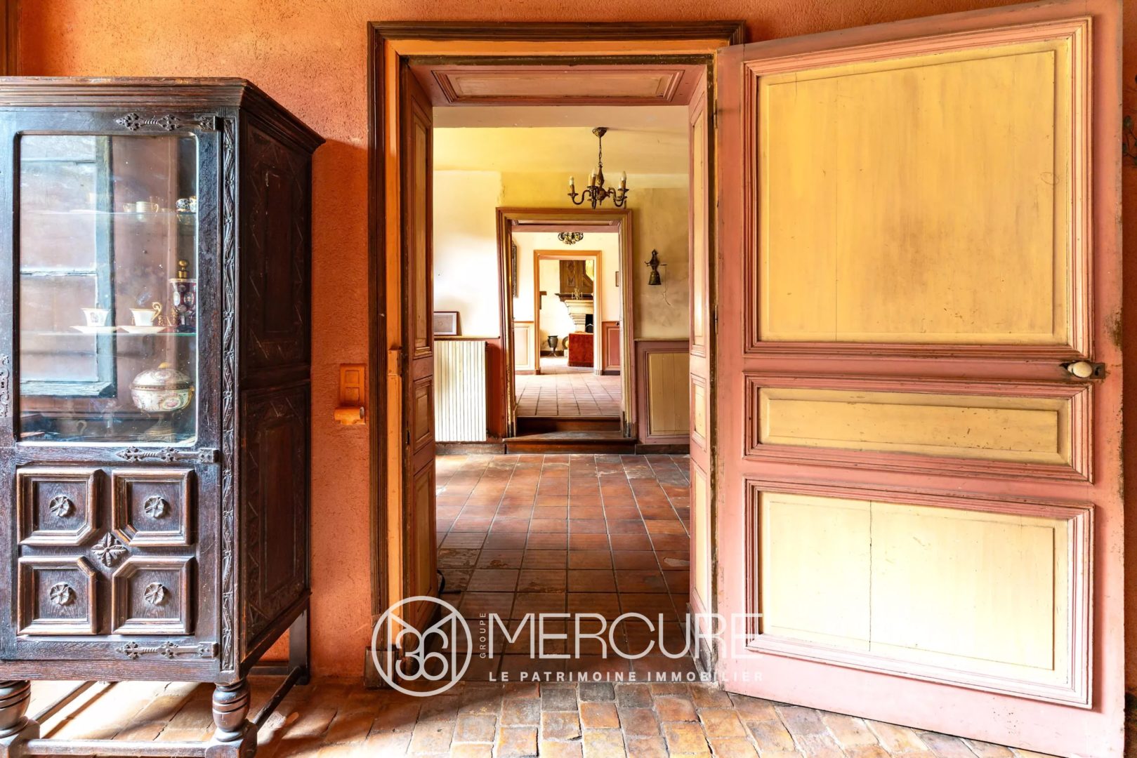 À gauche du hall d’entrée, nous entrons dans un petit salon avec des tomettes contiguës à un grand salon bibliothèque traversant et une cheminée monumentale.