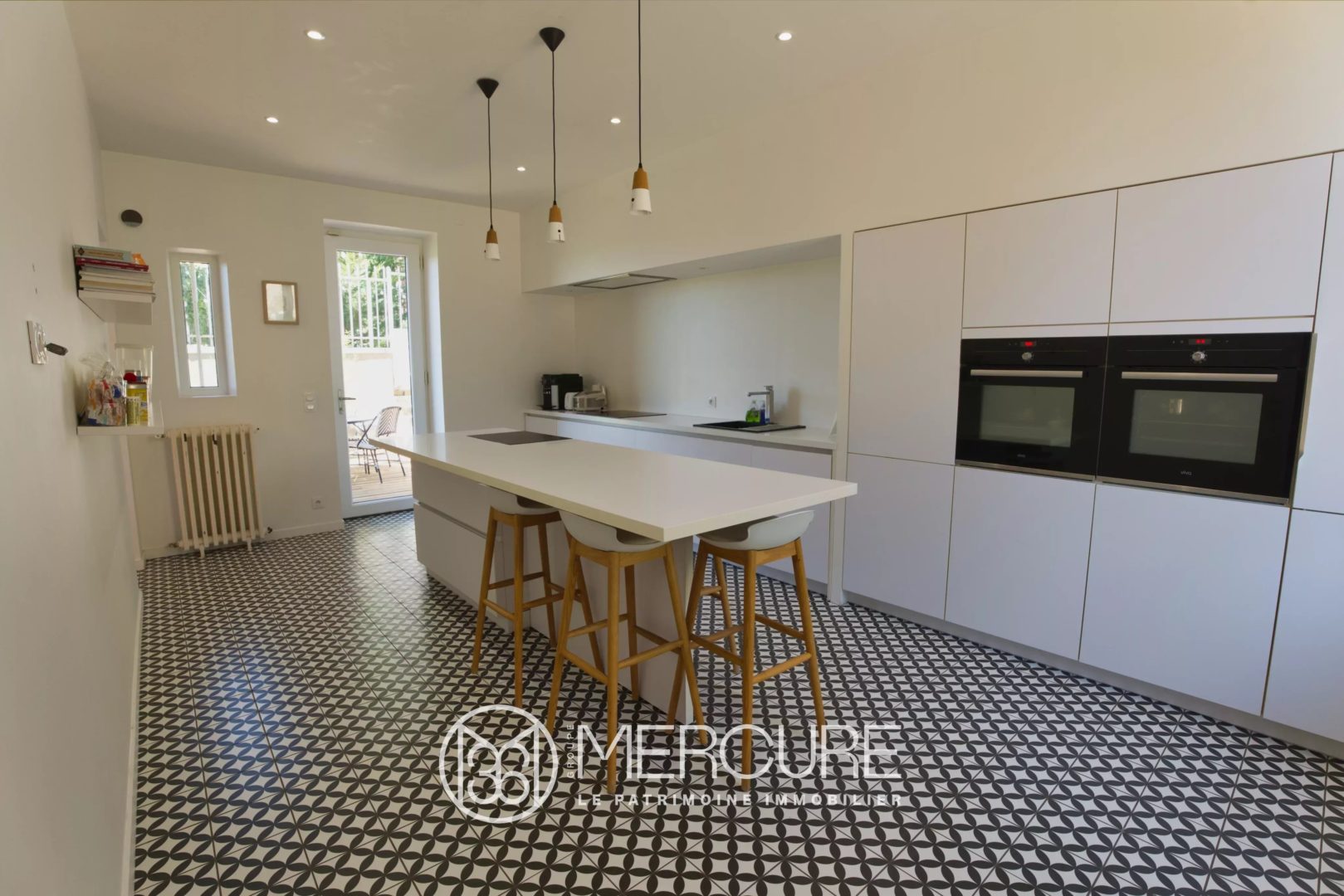 La salle à manger, également dotée d’une cheminée, communique avec une cuisine contemporaine aménagée et entièrement équipée, avec accès vers une terrasse intime et la cour intérieure. Un bureau, des toilettes invités et un dégagement avec rangements complètent ce niveau.