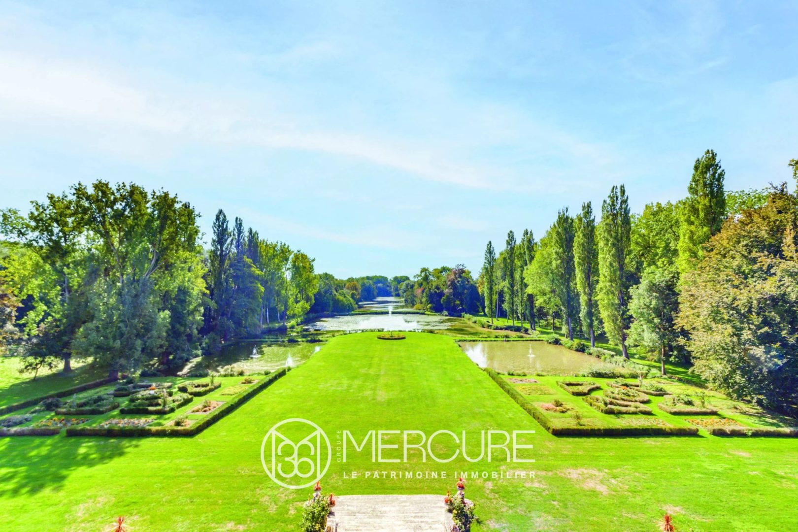 Précédé d’une cour d’honneur au Nord, le château est placé sur une terrasse plein Sud en surplomb d’un parc alternant pelouses et étangs, en pente douce vers la rivière. Ce parc à la française d’environ 10ha est prolongé par un bois de 8ha.