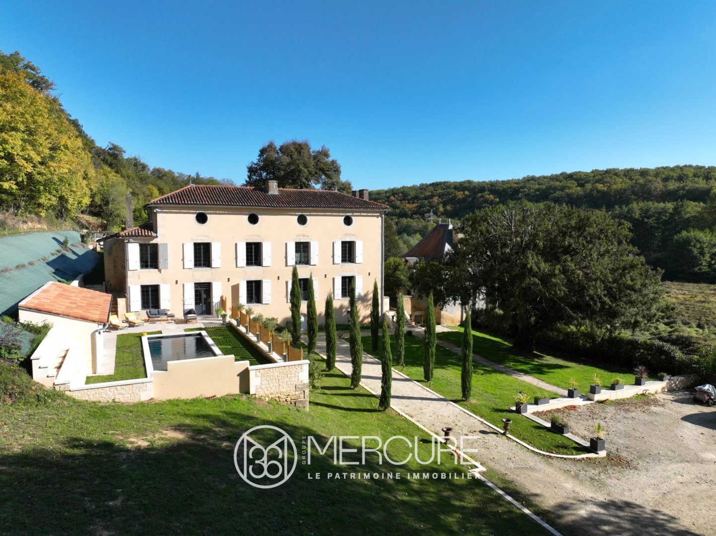 Le TERRAIN est constitué d’une cour sur l’avant aménagée en jardin à la française, et à l’arrière, jardin clos avec piscine, terrasse, cuisine d’été, sanitaires… Bois.