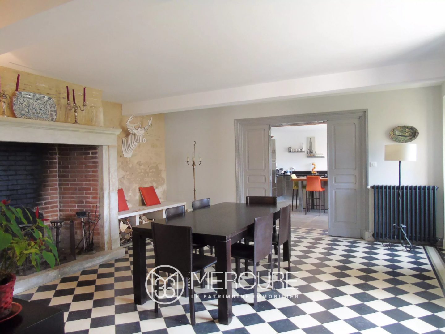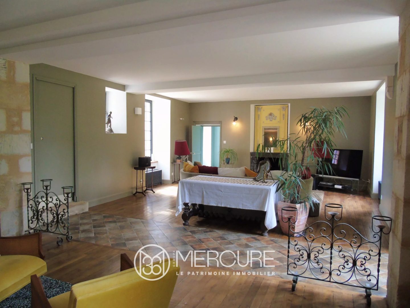 Une entrée sur dallage avec cabochon de 5.24 m² vous accueille. Elle est suivie d’une bibliothèque sur parquet chêne avec boiseries de 4.62 m², WC suspendu indépendant avec lave-mains sur parquet chêne de 2.32 m², un salon sur parquet chêne avec cheminée de 33.20 m², et un grand salon traversant sur parquet chêne avec cheminée de 57.81 m² ouvrant sur la terrasse (exposition Ouest). Une entrée secondaire avec escalier demi tournant sur carreaux ciment de 5.84 m² mène à la salle à manger sur carreaux ciment avec cheminée de 28.05 m², une cuisine aménagée et équipée avec ilot central sur carrelage de 25.06 m², un vestibule sur carrelage avec escalier de service de 10.05 m², WC avec lave-mains sur carrelage de 1.65 m², une chambre (norme P.M.R) sur parquet de 14.04 m² avec salle d’eau et WC sur parquet de 4.22 m².