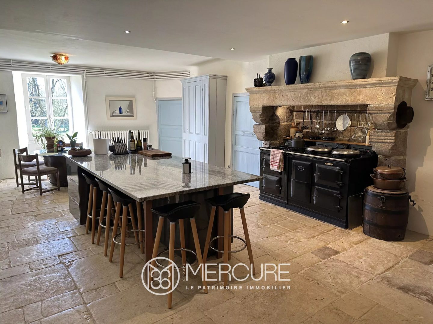 En rez-de-chaussée, un bel espace de vie sur dallage pierre ouvert sur le jardin offre une cuisine de 54 m² avec cheminée monumentale, une salle à manger avec cheminée en pierre, deux chambres (27 et 22m²) et une grande salle de bains de 20 m² ouvrant sur une terrasse avec spa. Egalement une buanderie, une cuisine d’été, un cellier…