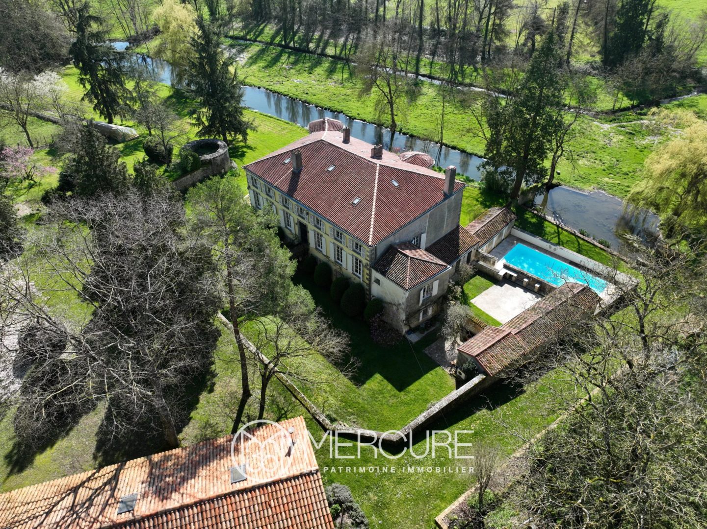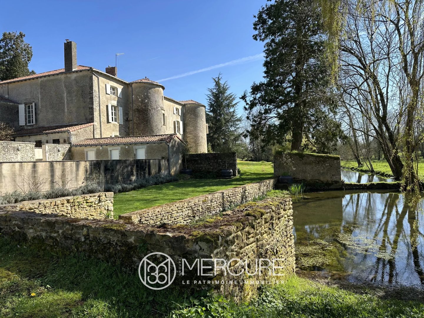 Dans une vallée préservée où coule en contrebas une rivière, Château de 860 m² habitables édifié au XVe siècle et modifié au XIXe offrant de beaux volumes et de nombreux éléments d’authenticité avec maison d’amis, piscine, spa et dépendances sur 9,35 hectares de parc, bois et prairie.