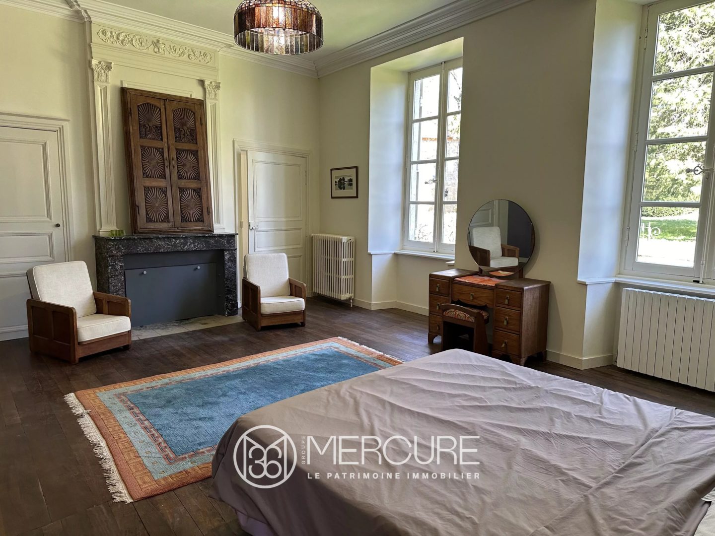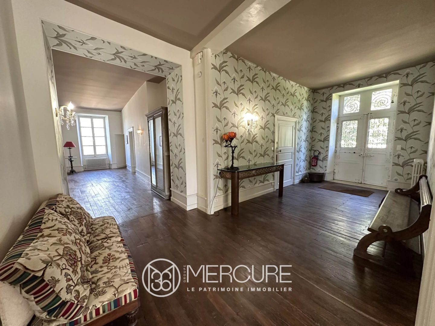 A l’étage sur parquet chêne et ouvrant sur le parc par une passerelle enjambant une douve sèche, se trouvent une entrée de 65 m², un salon avec cheminée marbre (36,35 m²), un salon de musique avec cheminée marbre (34,4 m²), trois belles chambres (25 à 30 m²) avec chacune leur salle de bains avec wc, un bureau et une bibliothèque.