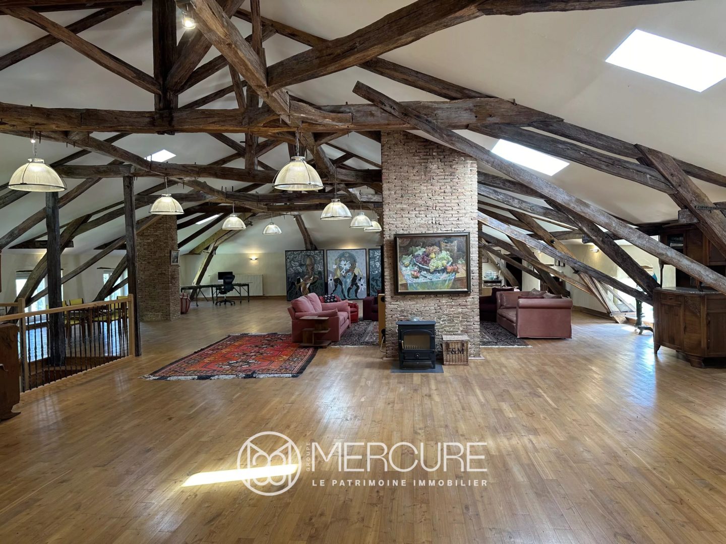 Au 2nd niveau sur parquet sapin, une magnifique pièce de 222 m² sous la charpente apparente complétée d’une cuisine et d’une chambre avec salle d’eau et dressing.