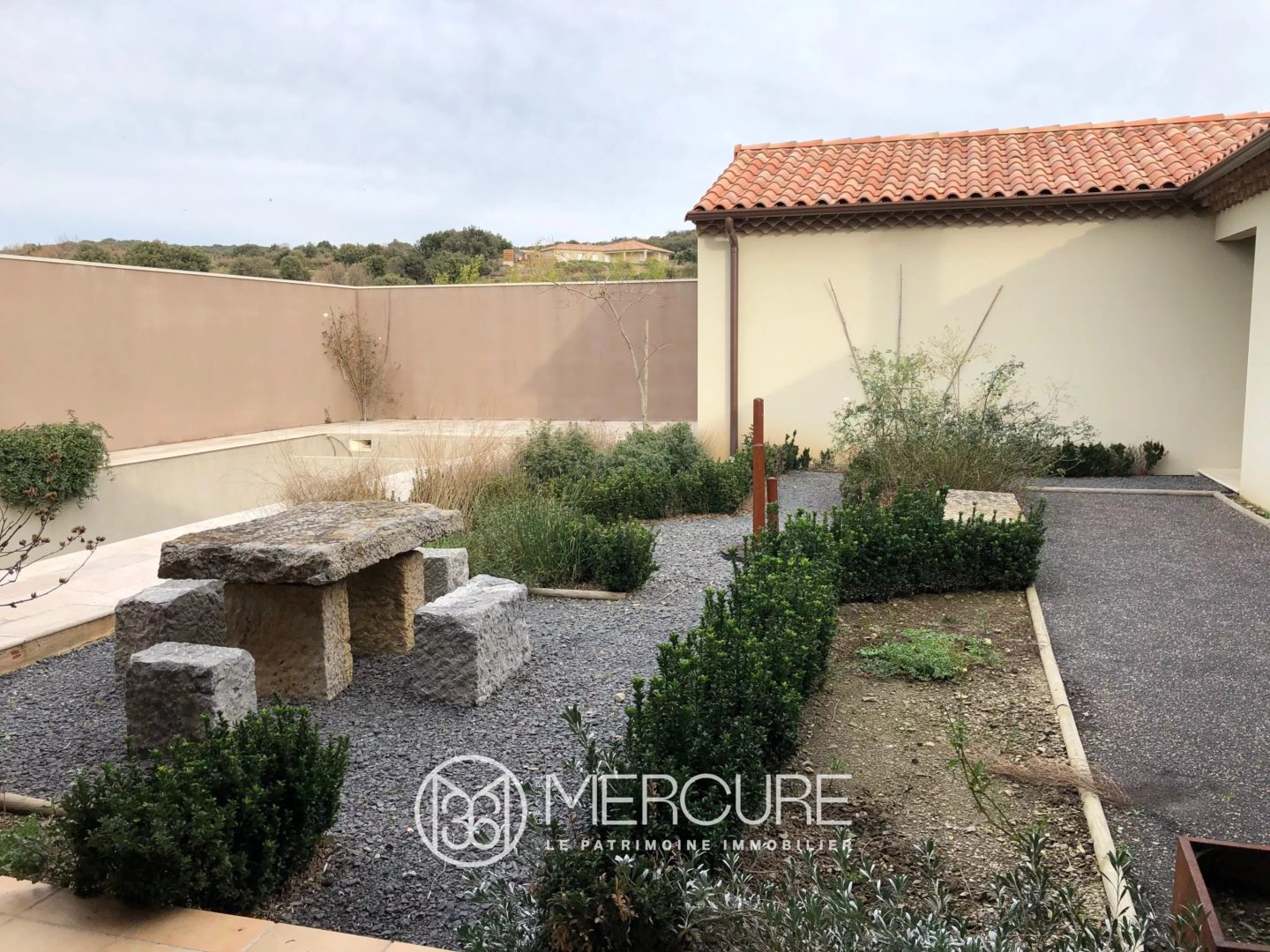 PISCINE en ciment 10 x 4 à terminer dans une cour fermée de 100m² sans de vis-à-vis, vue sur vignes, abri cuisine d’été évier BBQ 40m², douche et toilettes de 4m², pièce de rangement de 4m², local piscine à aménager de 7m², auvent avec matériel de culture de 50m².