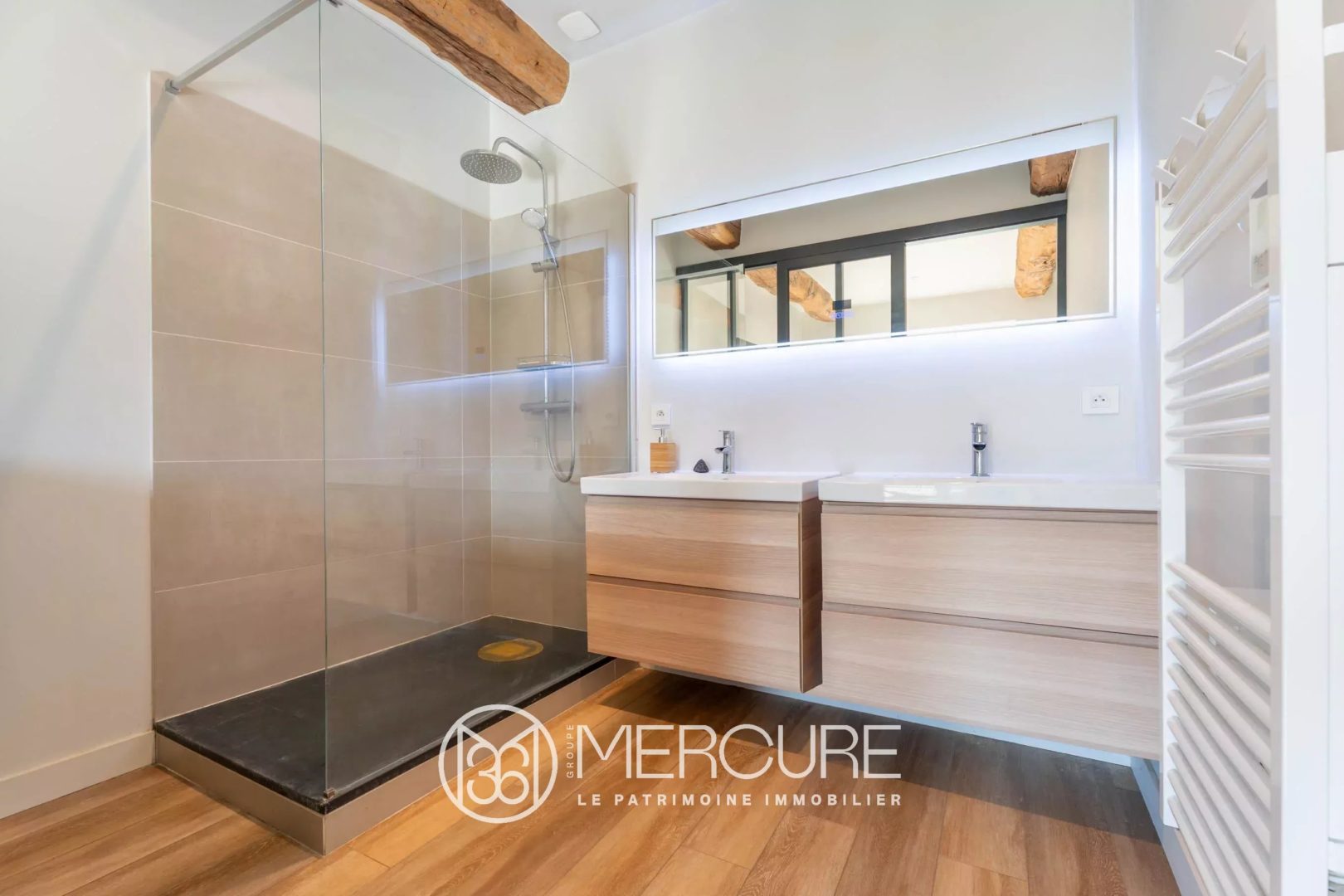 Le rez-de-chaussée, entièrement rénové avec des matériaux haut de gamme, met en valeur des plafonds à la française restaurés, une élégante cage d’escalier en pierre et bois, une cheminée en pierre dans le séjour plein sud, une cuisine / salle-à-manger avec cellier terrasse et four à pain, ainsi qu’une suite parentale de plain-pied.
