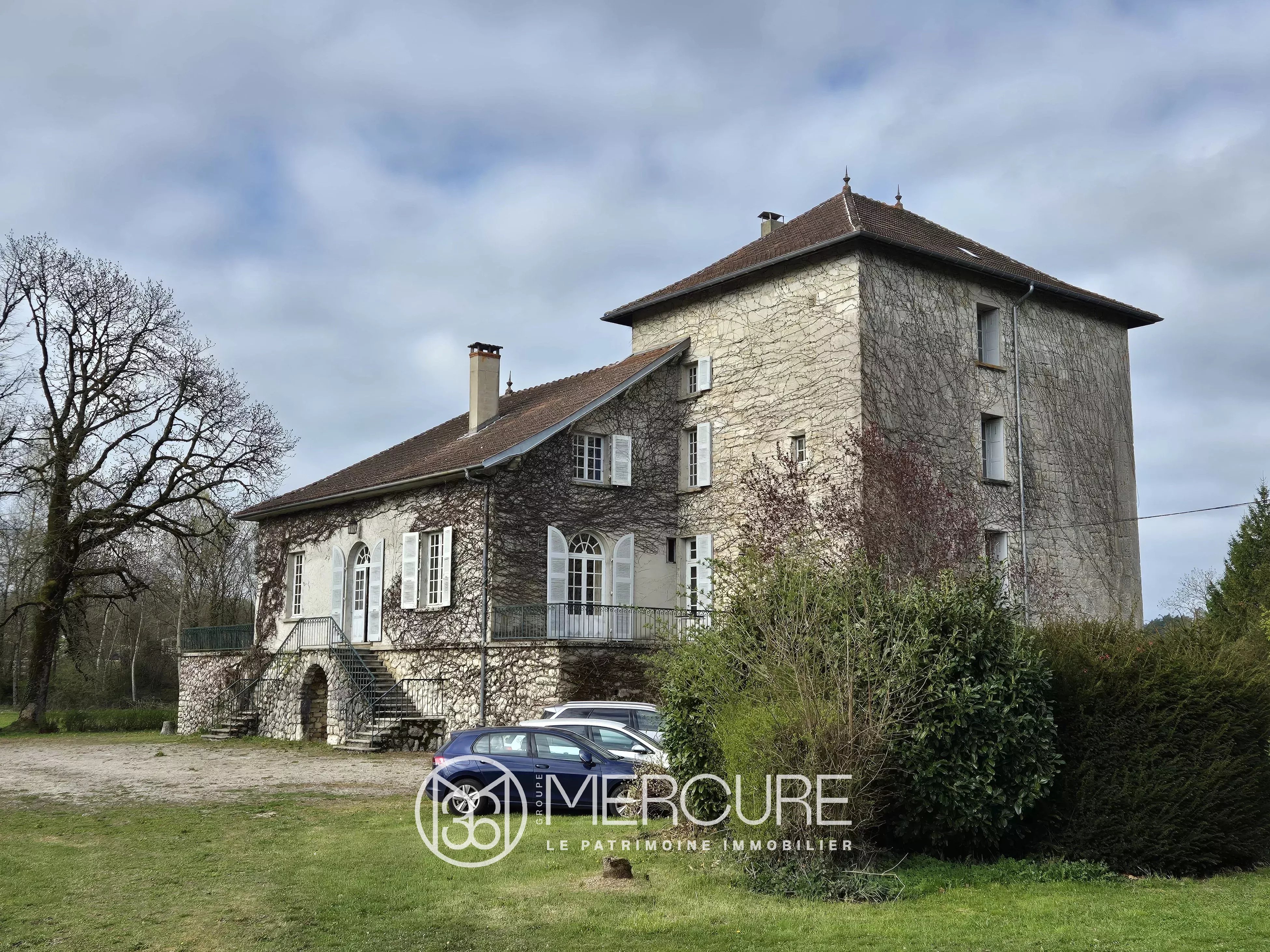 Sur un agréable et bucolique plateau du Haut-Bugey, propriété de charme puisant ses origines au XIV° s, remaniée par la suite et en particulier fortement dans les années 50 à la suite d’un incendie de représailles sur la fin de la seconde guerre mondiale qui a détruit l’essentiel de ce qui était un puissant château local.