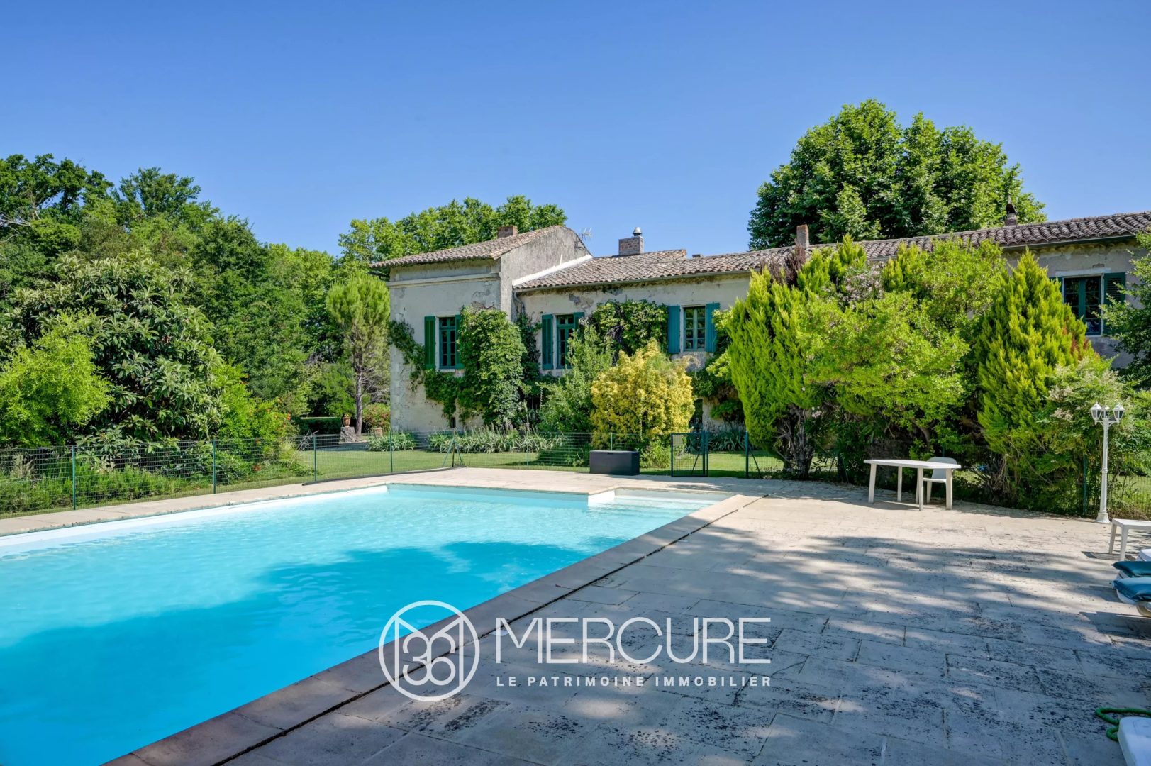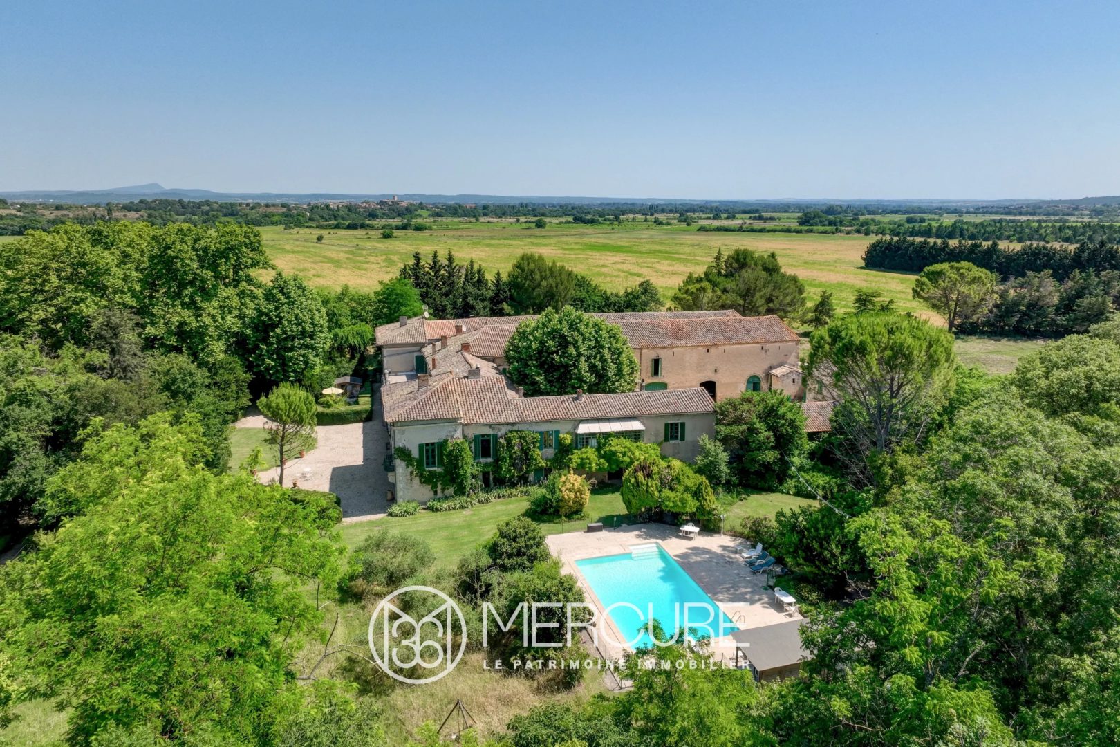 Les bâtiments sont disposés en en forme de U autour d’une élégante cour d’arrivée, la maison de Maître au centre et les dépendances réparties de chaque côté. L’ensemble du bâti a beaucoup d’allure. La maison de Maître ouvre à l’opposé de la cour d’arrivée sur un ravissant parc aux arbres centenaires et une belle piscine de 12mx7m et un pool -house qui participent à la noblesse et à l’agrément des lieux. L’emplacement de cette propriété n’est pas le fruit du hasard un puits bâti, autrefois à roue avec sa noria(aujourd’hui équipé d’une pompe) adossé à une citerne et à un lavoir assure depuis plusieurs siècles l’alimentation en eau. Evidemment le mas est également raccordé depuis quelques années au réseau public de Nîmes Métropôle et en plus un second puits a également été crée.