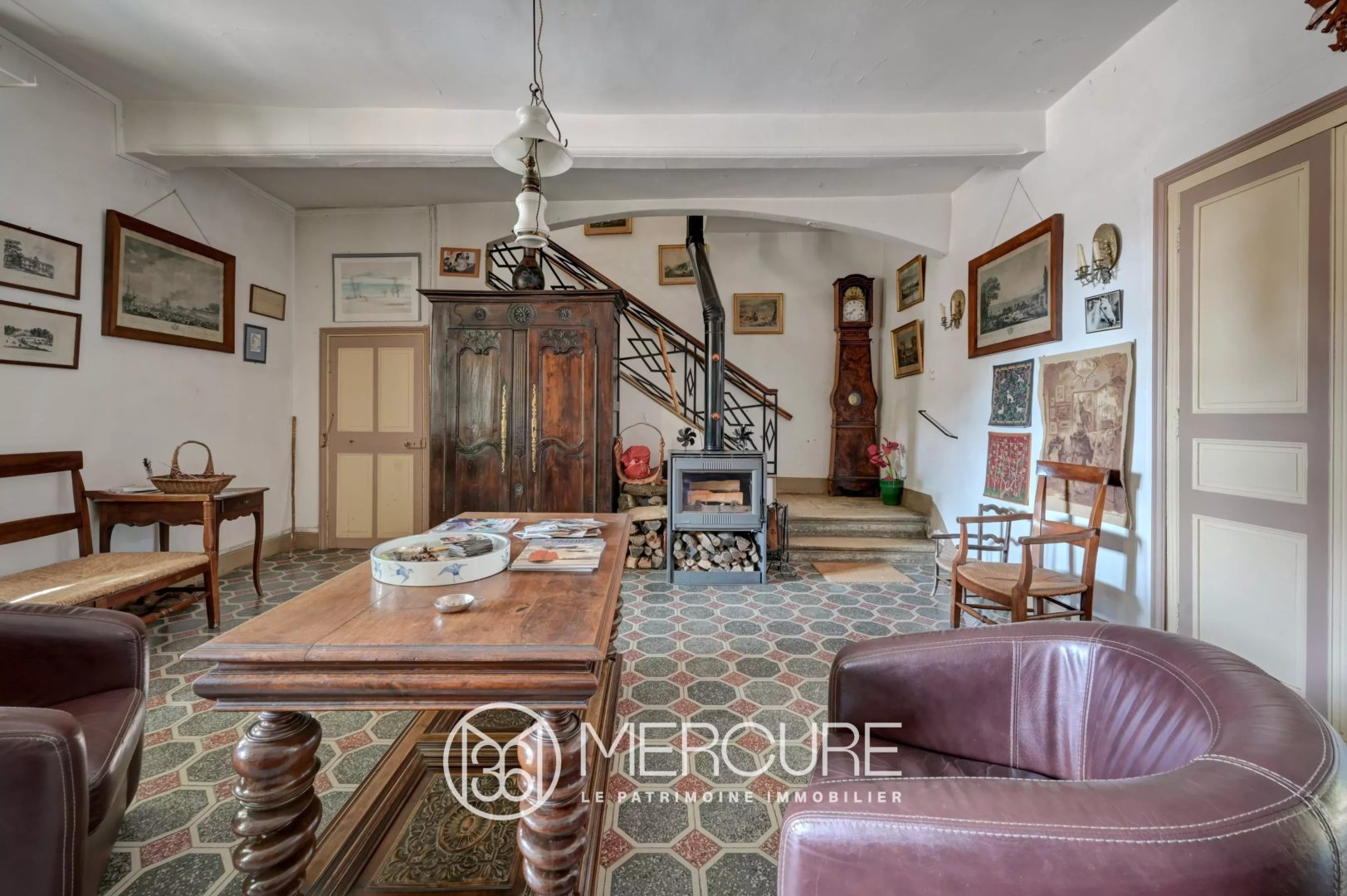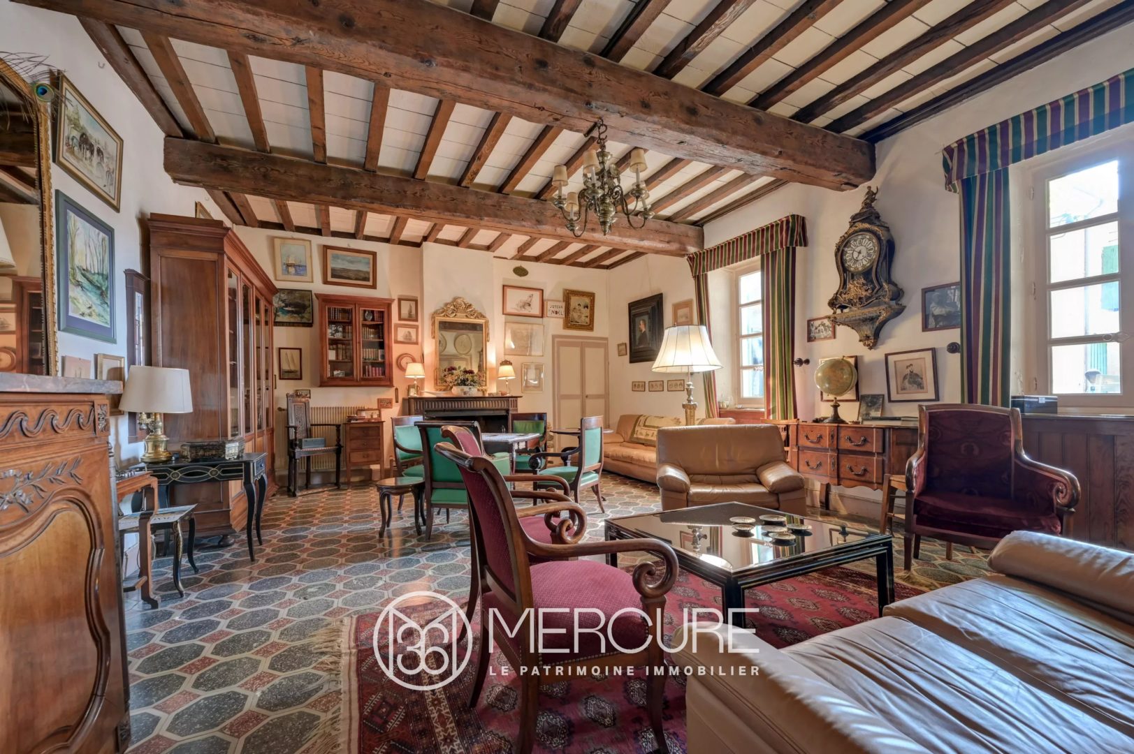Côté cour : imposant vestibule-salon avec escalier en pierre conduisant à l’étage, grand salon avec plafond à la française et cheminée, cuisine avec entrée de service, cellier, buanderie.
