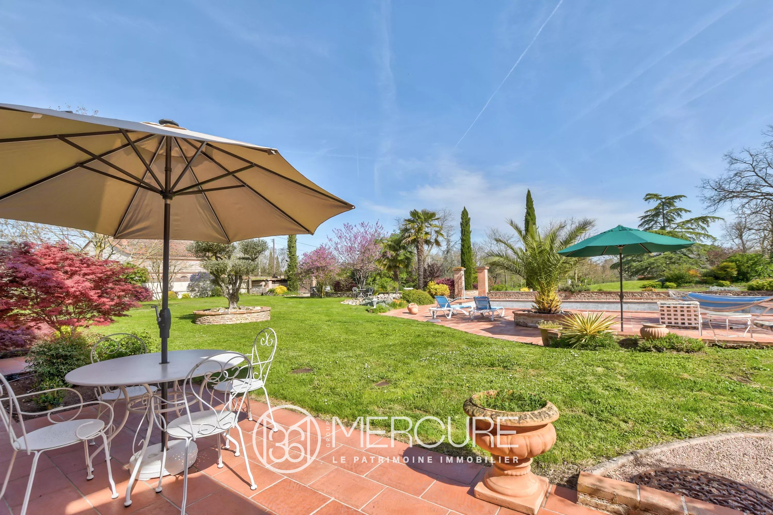 Plusieurs espaces extérieurs sont aménagés de manière conviviale, dont un vaste salon couvert, un barbecue, une remise pour les outils de jardin, un abri de jardin, une fontaine.