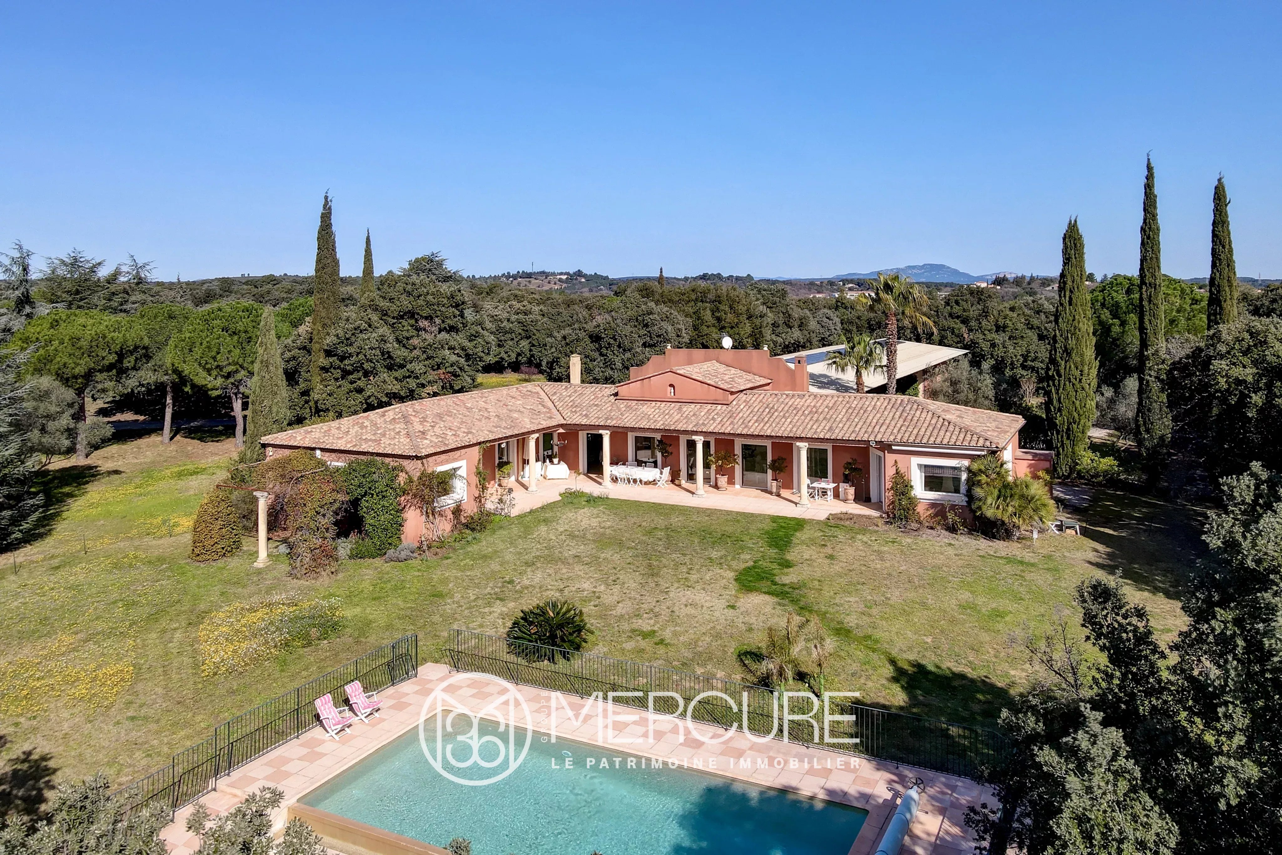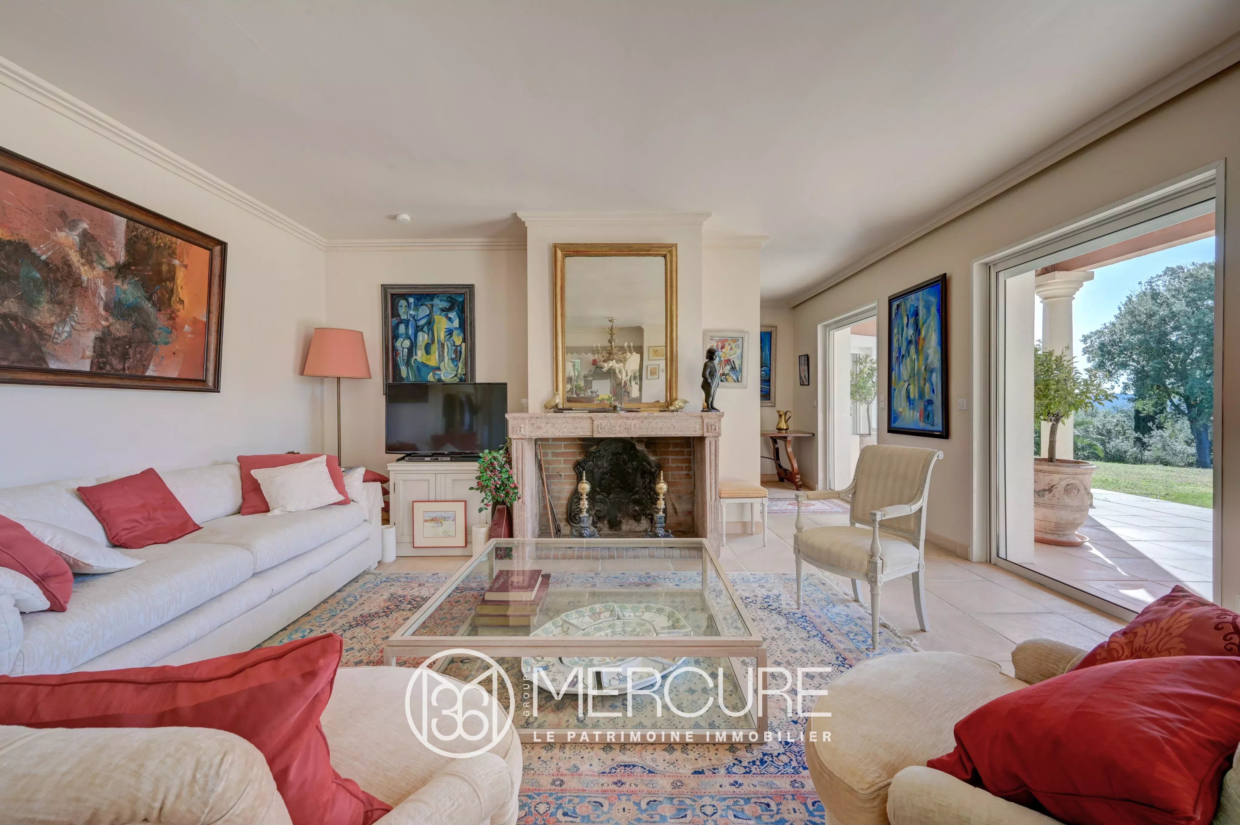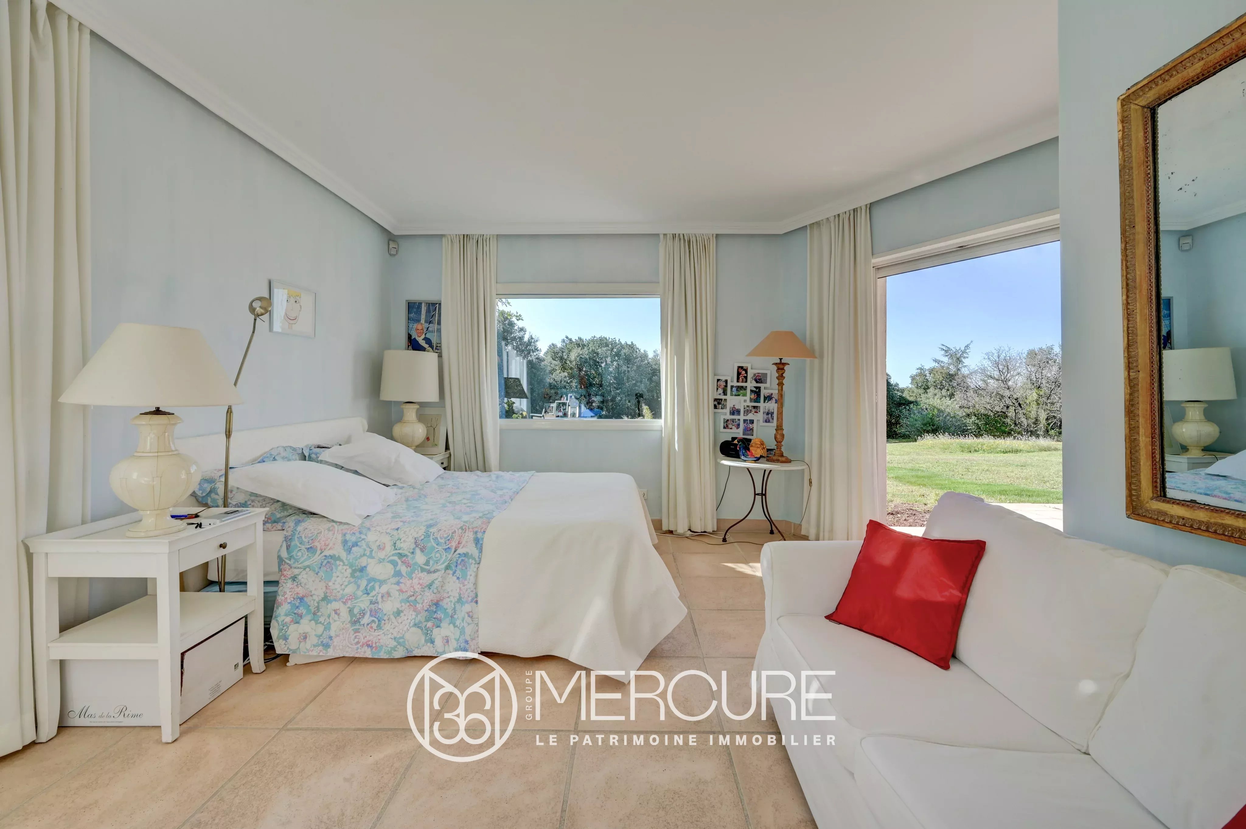 Sa position dominante offre une vue panoramique jusqu’à la mer. Baignée de lumière, cette demeure de plain-pied s’ouvre sur une grande terrasse, une vaste pelouse, et une splendide piscine à débordement de 11x5m, chauffée et sécurisée.