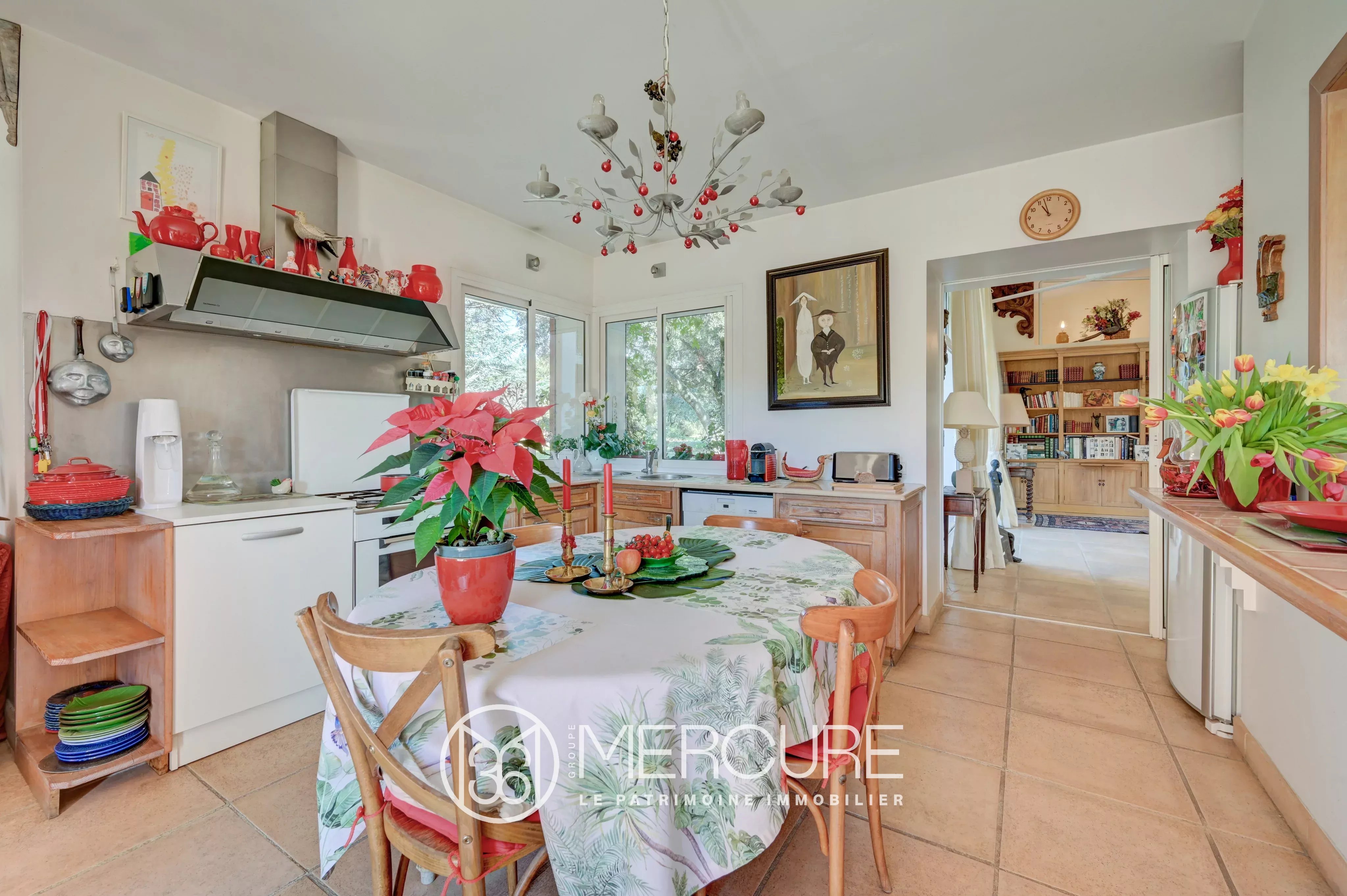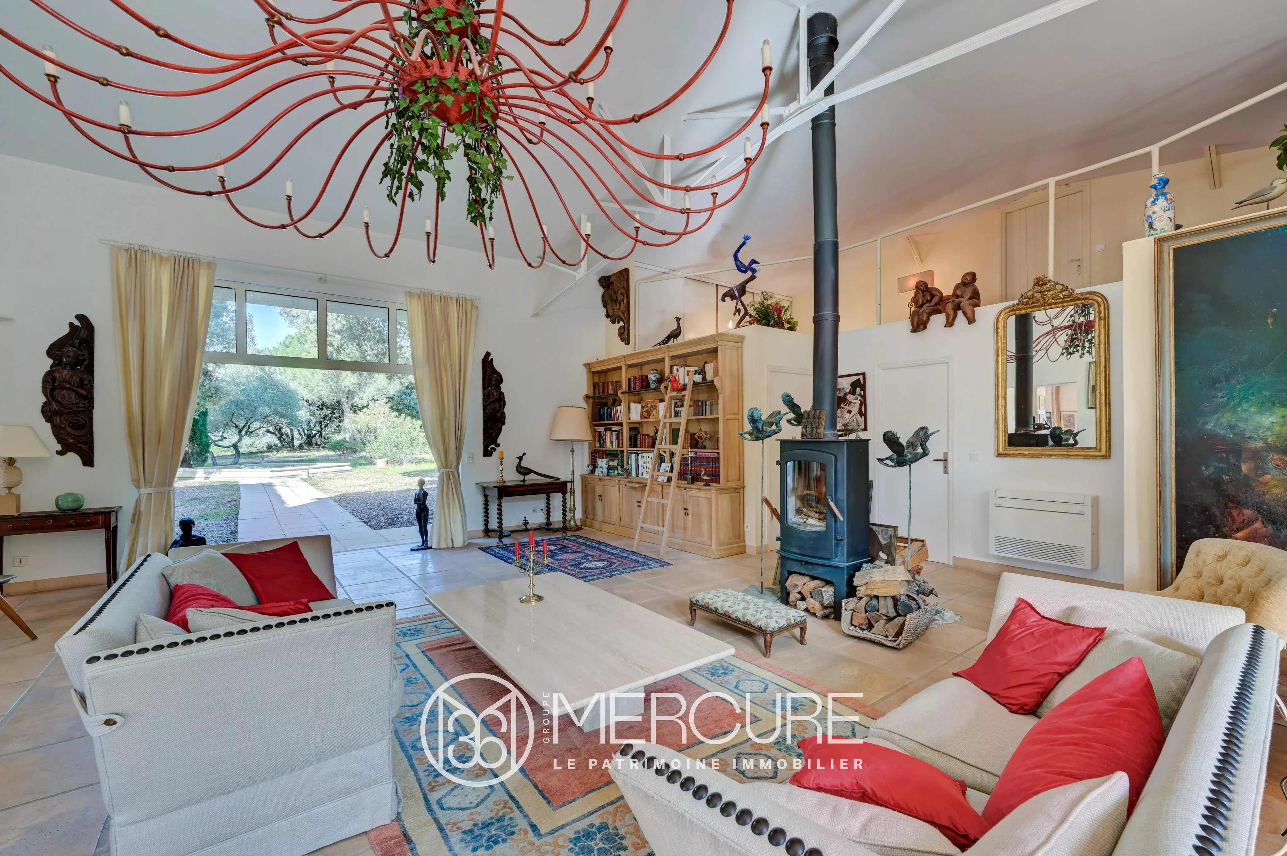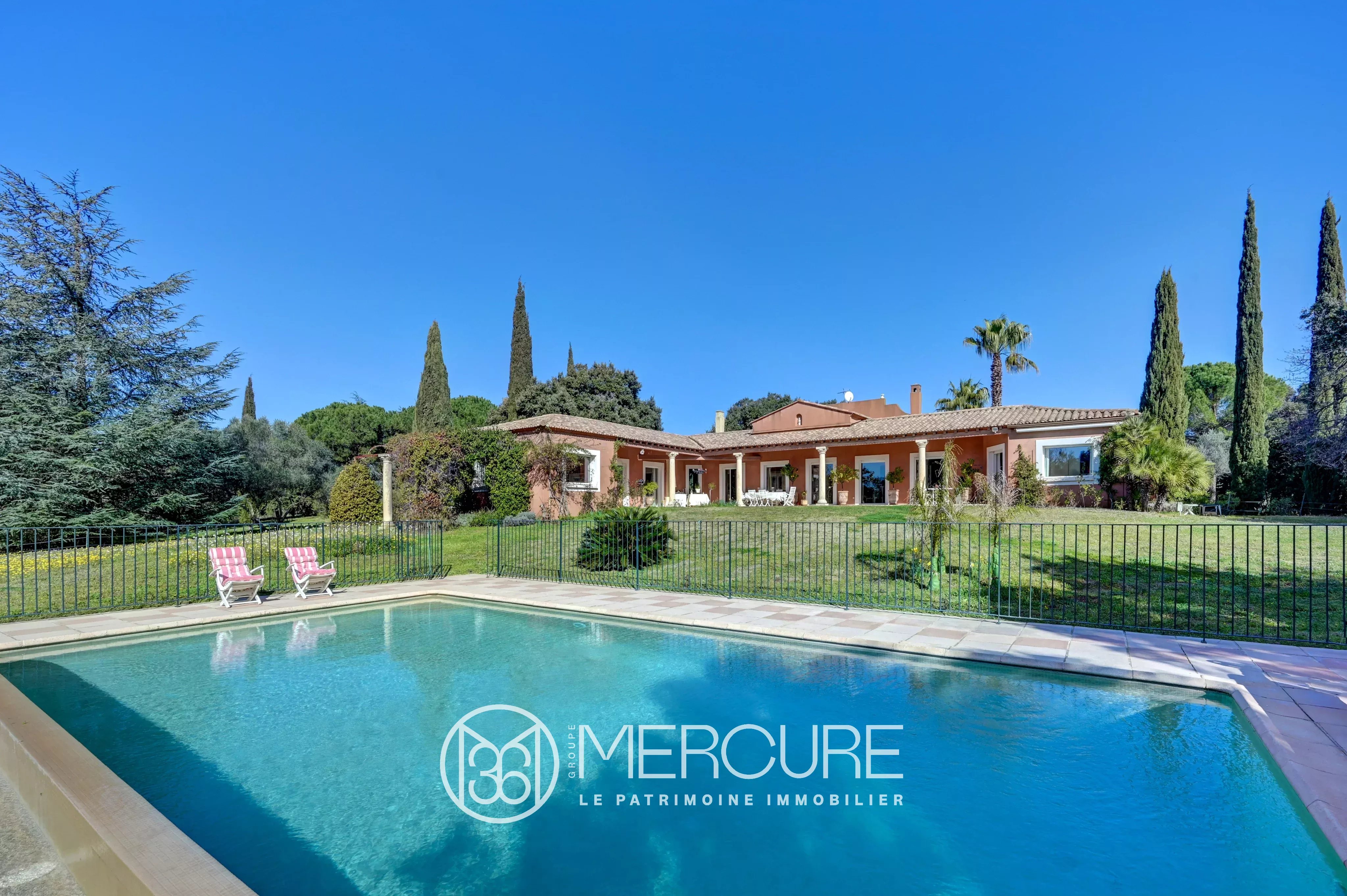 Sa position dominante offre une vue panoramique jusqu’à la mer. Baignée de lumière, cette demeure de plain-pied s’ouvre sur une grande terrasse, une vaste pelouse, et une splendide piscine à débordement de 11x5m, chauffée et sécurisée.
